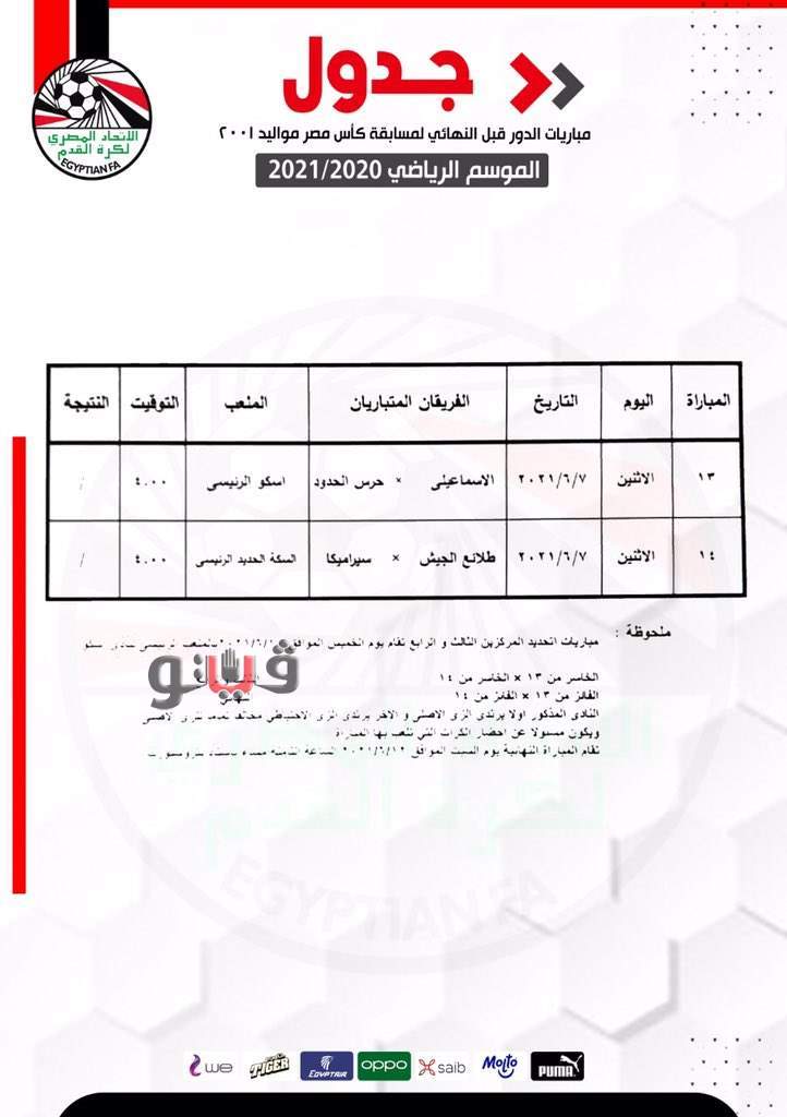 أعلنت إدارة المسابقات بالإتحاد المصري لكرة القدم، مواعيد مباراتي الدور نصف النهائي لبطولة كأس مصر للشباب مواليد 2001 على التالي: