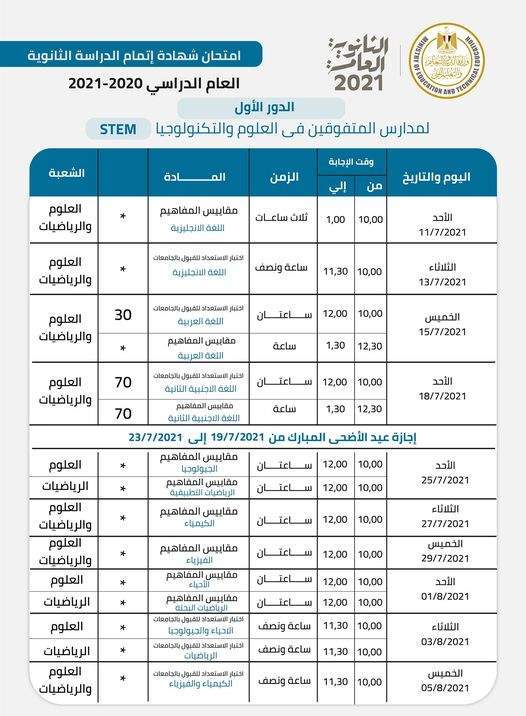 ومن المقرر أن تنطلق امتحانات شهادة إتمام الثانوية العامة لمدارس المتفوقين في العلوم والتكنولوجيا STEM في الفترة من الأحد 11/7/2021 وتستمر حتى الخميس 5/8/2021.
