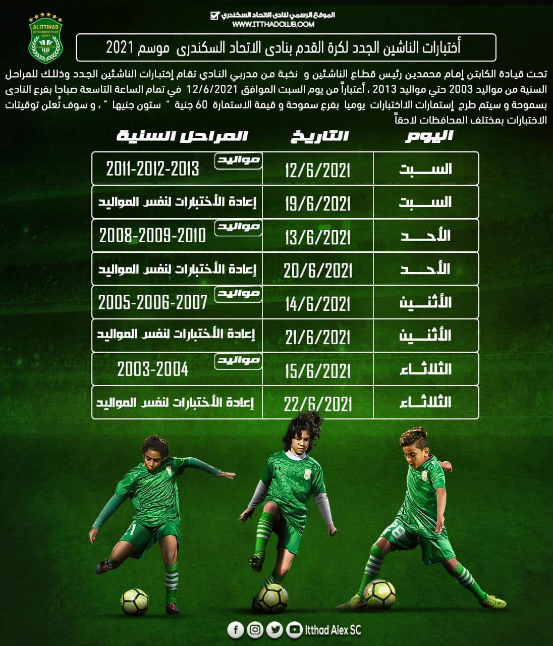 أعلن نادي الاتحاد السكندري عن موعد اختبارات الناشئين 2021 -2022 بمقابل 60 جنيها لاستمارة الاختبار للأعمار السنية من مواليد 2003 حتى 2013.