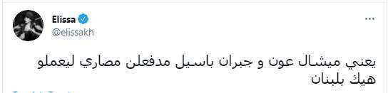 وكتبت الفنانة إليسا تغريدة على تويتر قالت فيها "يعني ميشال عون و جبران باسيل مادفع مصاري ليعملوا هيك بلبنان".