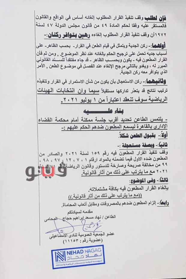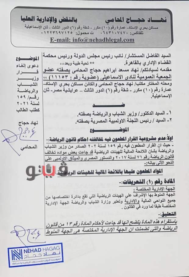 وأكد نهاد حجاج في دعواه أن بعض مواد اللائحة المالية تتعدى على سلطات الجمعيات العمومية الممنوحة لهم من خلال لوائح النظام الأساسي للهيئات الرياضية.