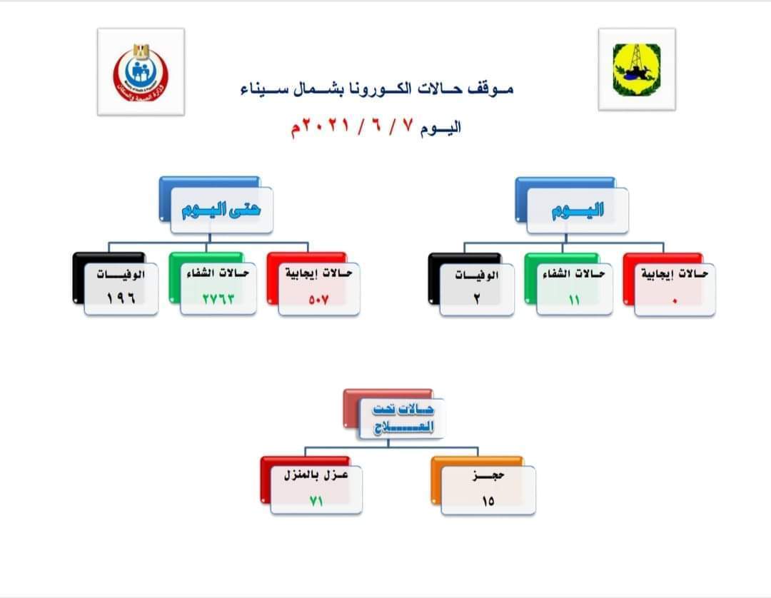 أعلنت مديرية الصحة بشمال سيناء عن تسجيل حالتي وفاة جديدة مصابة بفيروس كورونا المستجد أثناء تلقيها العلاج في مستشفى العريش العام، ليصل عدد الحالات إلى 196 على مستوى المحافظة منذ بداية الجائحة.