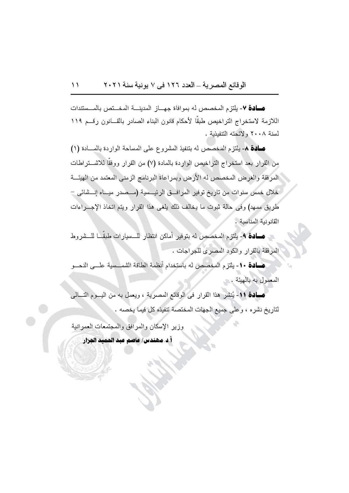 وجاء في المادة الأولى للقرار اعتماد تعديل تخطيط وتقسيم قطعة الأرض رقم (3ب/1) بمساحة 2.5 فدان بما يعادل 10500متر مربع، الواقعة بالحوض رقم (9) بالحزام الأخضر بمدينة 6 أكتوبر والمخصصة لـ عماد فاروق عبد الله معوض لإقامة مشروع سكنى بمقابل عينى، وذلك طبقًا للحدود الموضحة على الخريطة بهذا القرار، والعقد المبرم بتاريخ 3/11/2019، والتى تعتبر جميعها مكملة لهذا القرار.