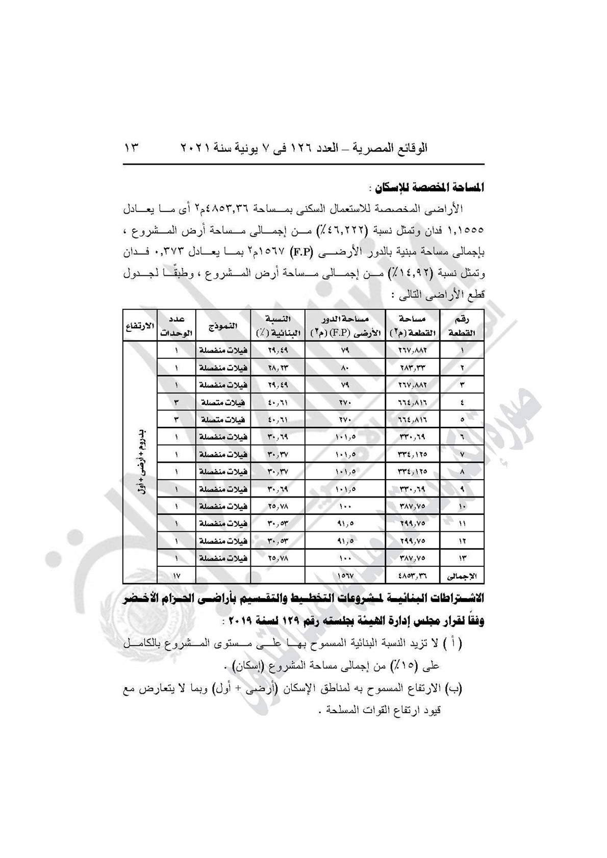 نشرت جريدة الوقائع المصرية في عددها رقم 126، الصادر في 7 يونية 2021، قرار وزارة الإسكان والمرافق والمجتمعات العمرانية بشأن باعتماد تعديل تخطيط وتقسيم قطعة الأرض رقم (3ب/1) بمساحة 2.5 فدان بما يعادل 10500 متر مربع، الواقعة بالحوض رقم (9) بالحزام الأخضر بمدينة 6 أكتوبر، لإقامة مشروع سكنى بمقابل عينى.