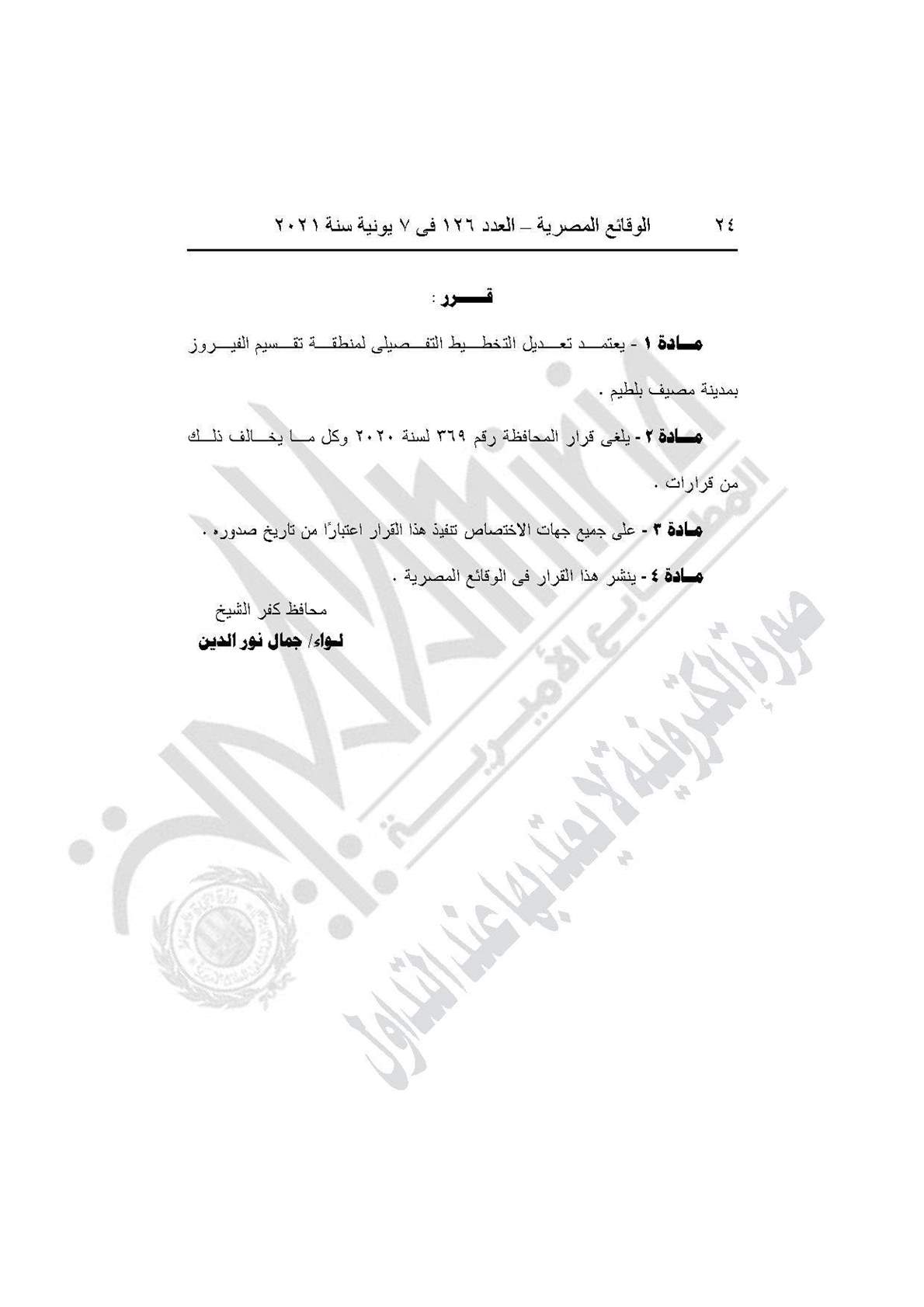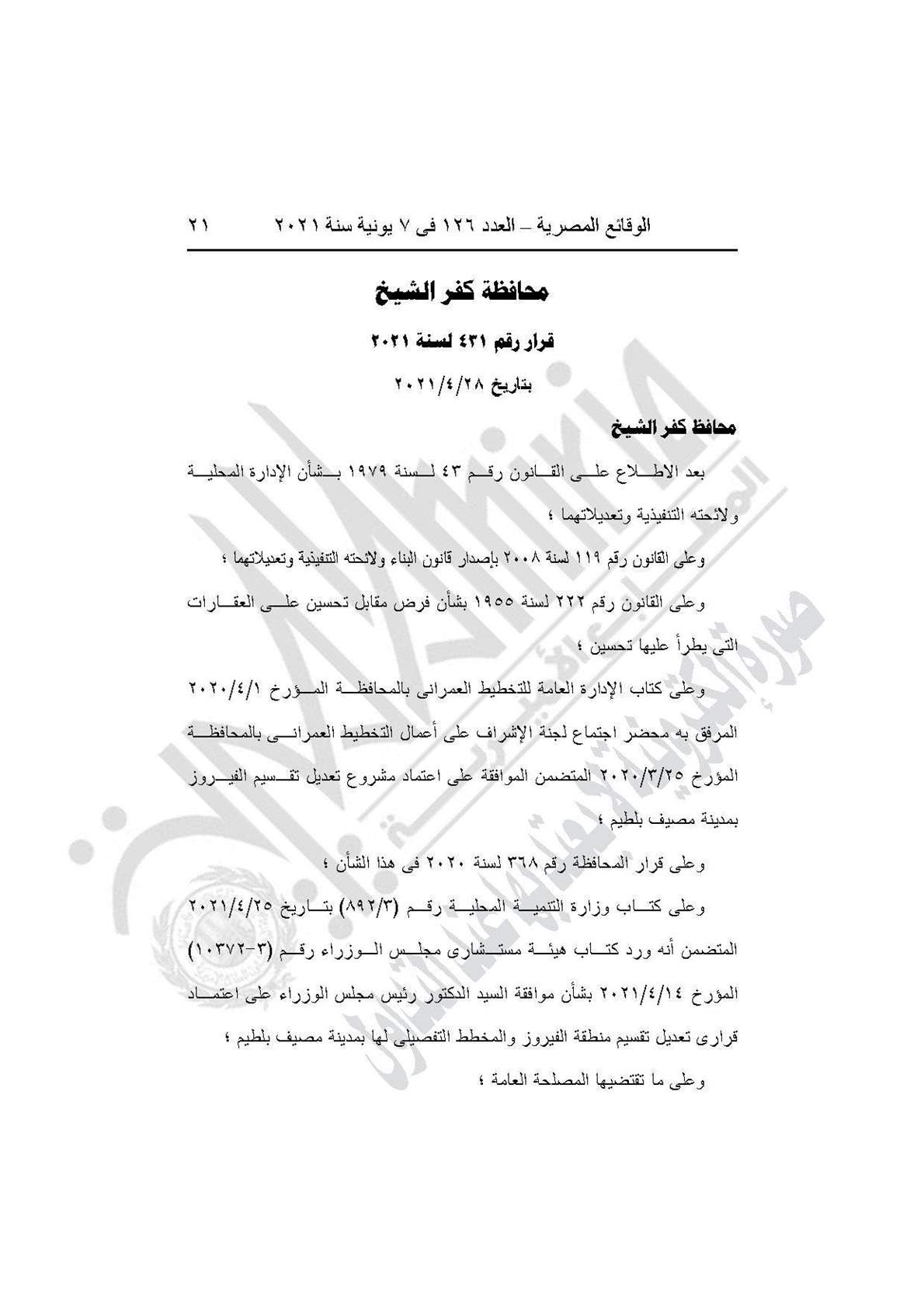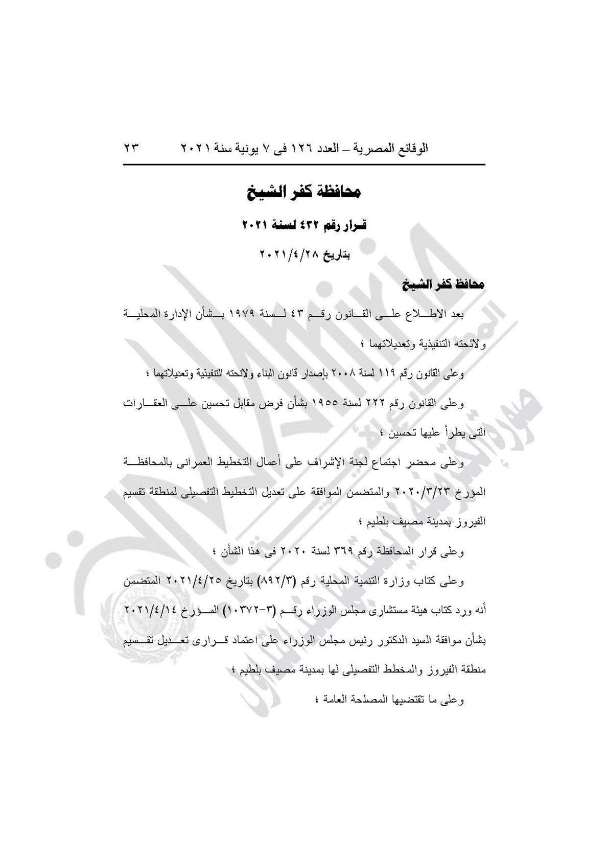 والقرار رقم 432 لسنة 2021، باعتماد تعديل التخطيط التفصيلى لمنطقة تقسيم الفيروز بمدينة مصيف بلطيم .