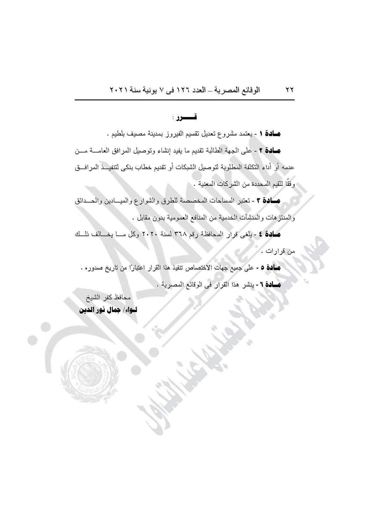 والقرار رقم 341 لسنة 2021، باعتماد مشروع تعديل تقسيم الفيروز بمدينة مصيف بلطيم. وعلى الجهة الطالبة تقديم ما يفيد إنشاء وتوصيل المرافق العامة من عدمه، أو أداء التكلفة المطلوبة لتوصيل الشبكات أو تقديم خطاب بنكي لتنفيذ المرافق وفقًا للقيم المحددة من الشركات المعنية.