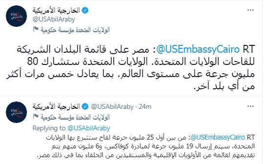 وكتبت الخارجية الأمريكية تغريدة على تويتر قالت فيها: "مصر على قائمة البلدان الشريكة للقاحات الولايات المتحدة. الولايات المتحدة ستشارك 80 مليون جرعة على مستوى العالم، بما يعادل خمس مرات أكثر من أي بلد آخر".