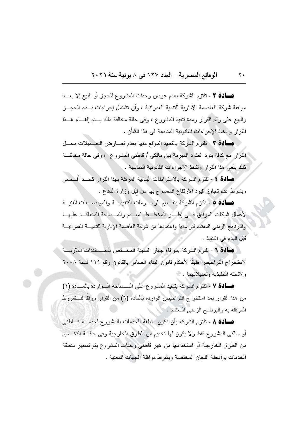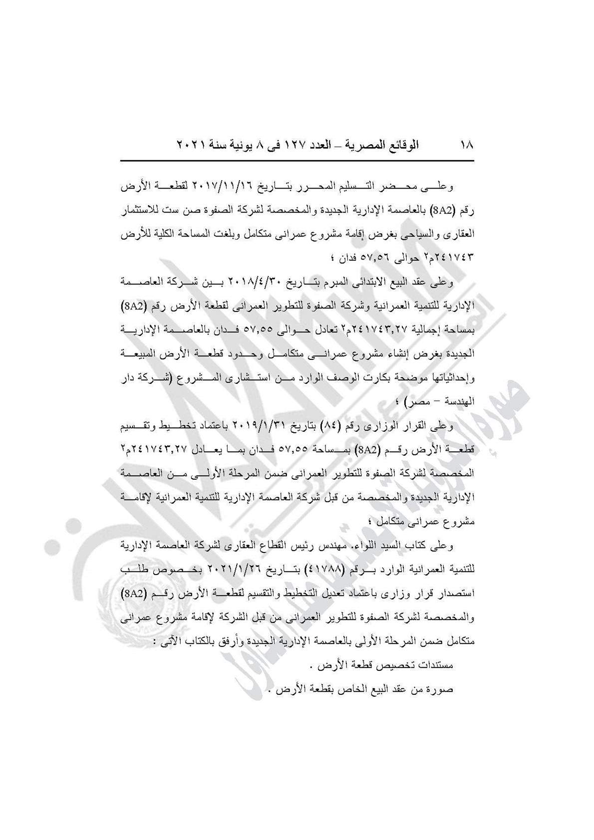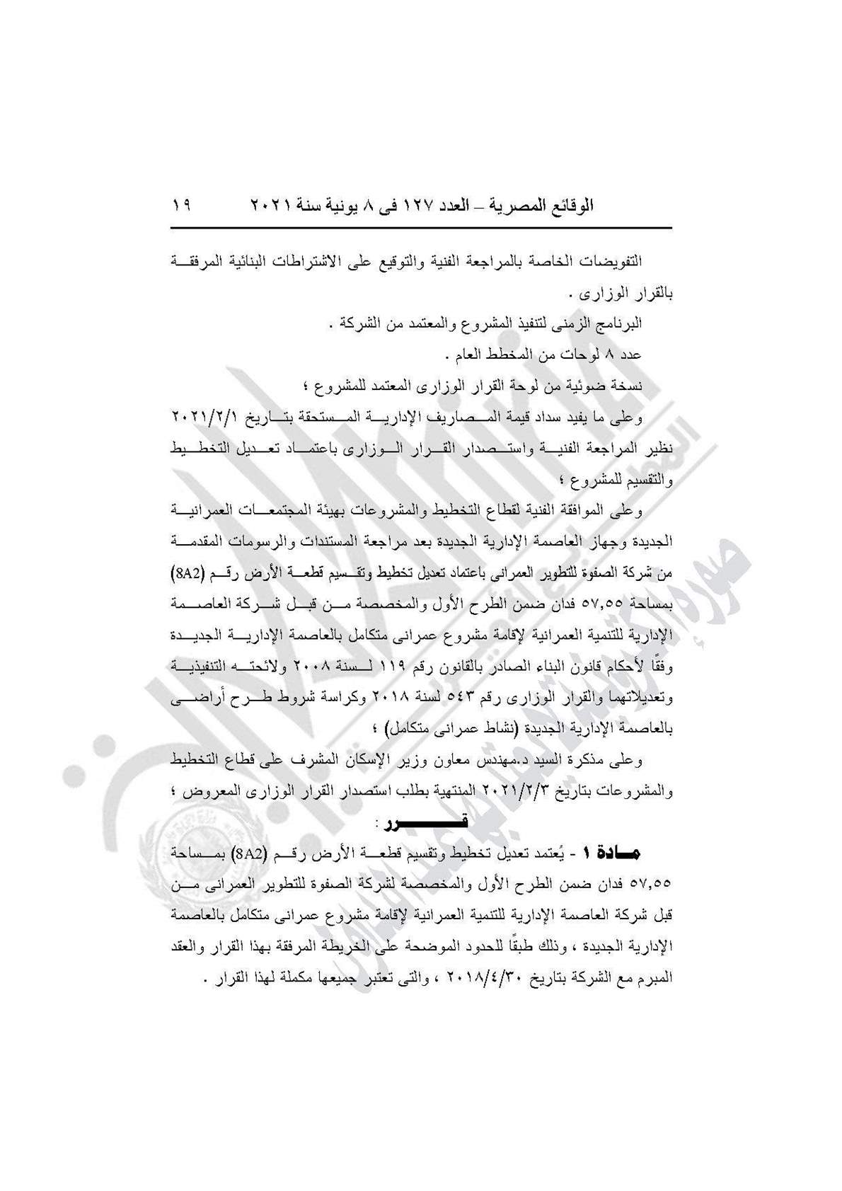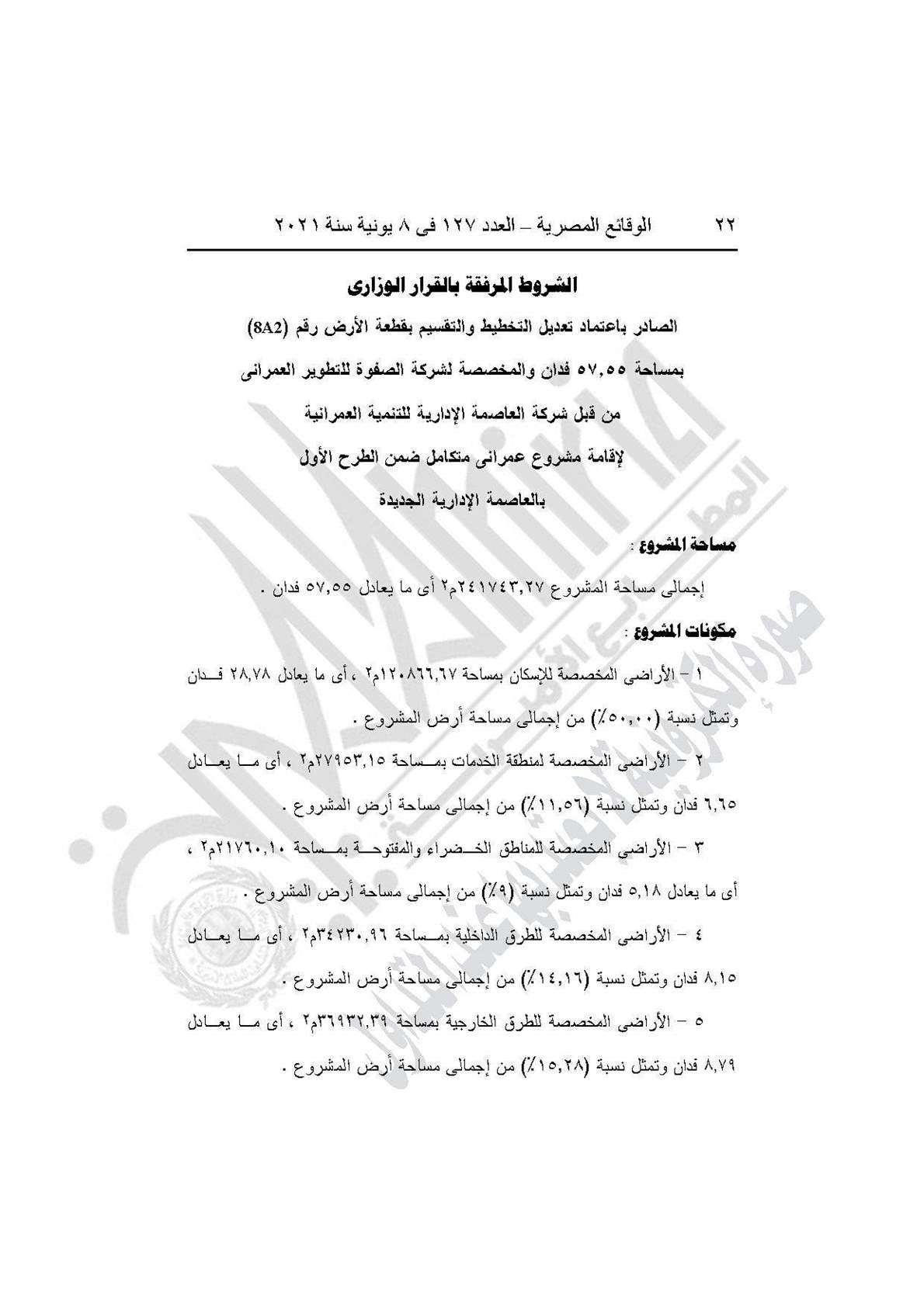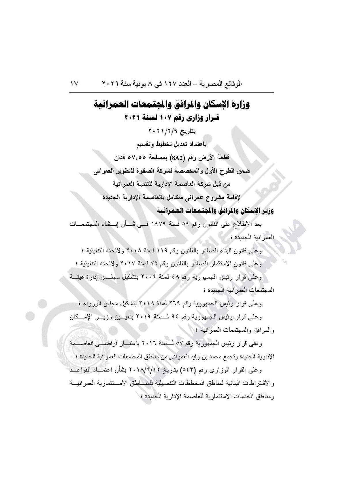 نشرت جريدة الوقائع المصرية في عددها رقم 127، الصادر في 8 يونيو 2021، قرارين لوزارة الإسكان والمرافق والمجتمعات العمرانية، بشأن اعتماد تعديل تخطيط مشروع عمرانى متكامل بالعاصمة الإدارية الجديدة. وإضافة مادة جديدة إلى اللائحة التنفيذية لقانون البناء.