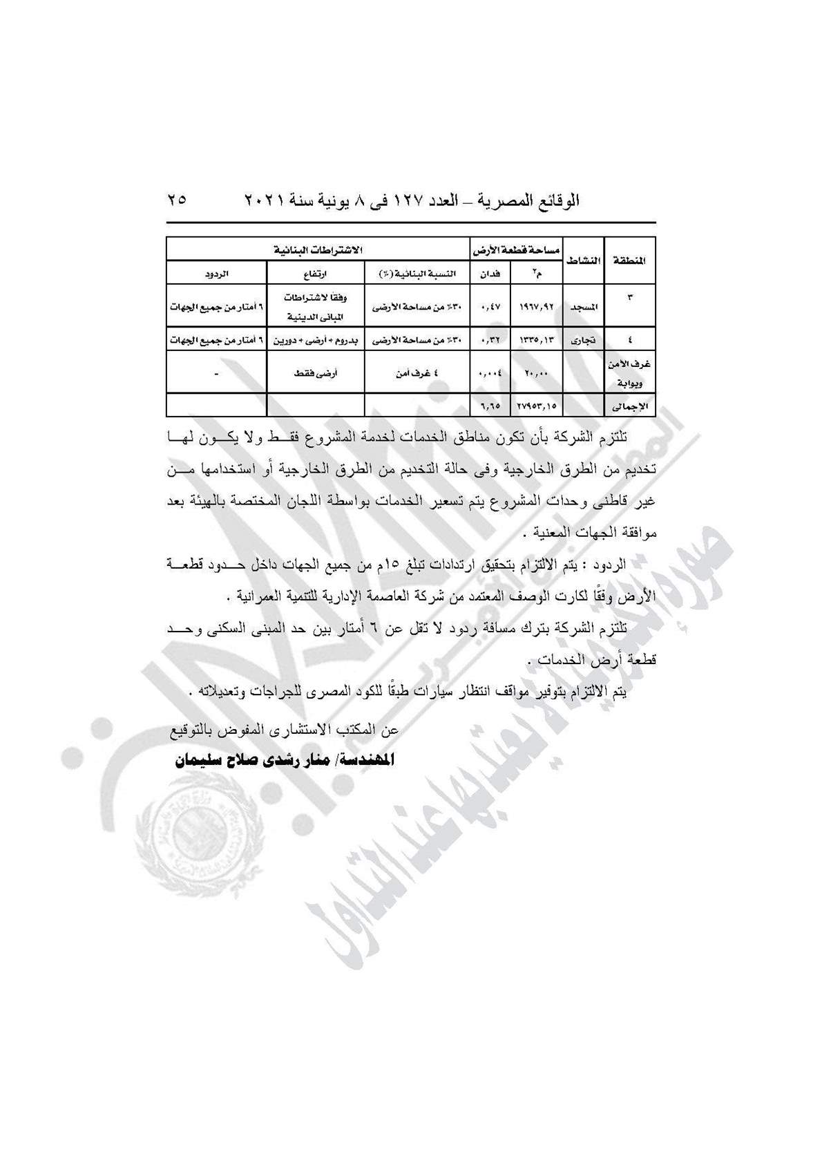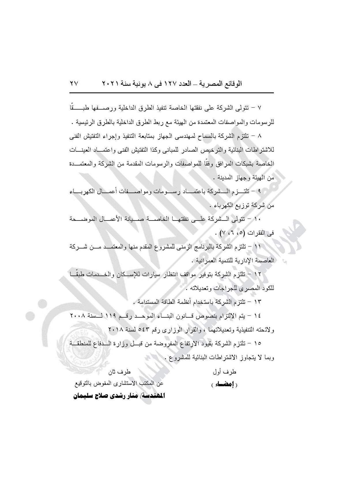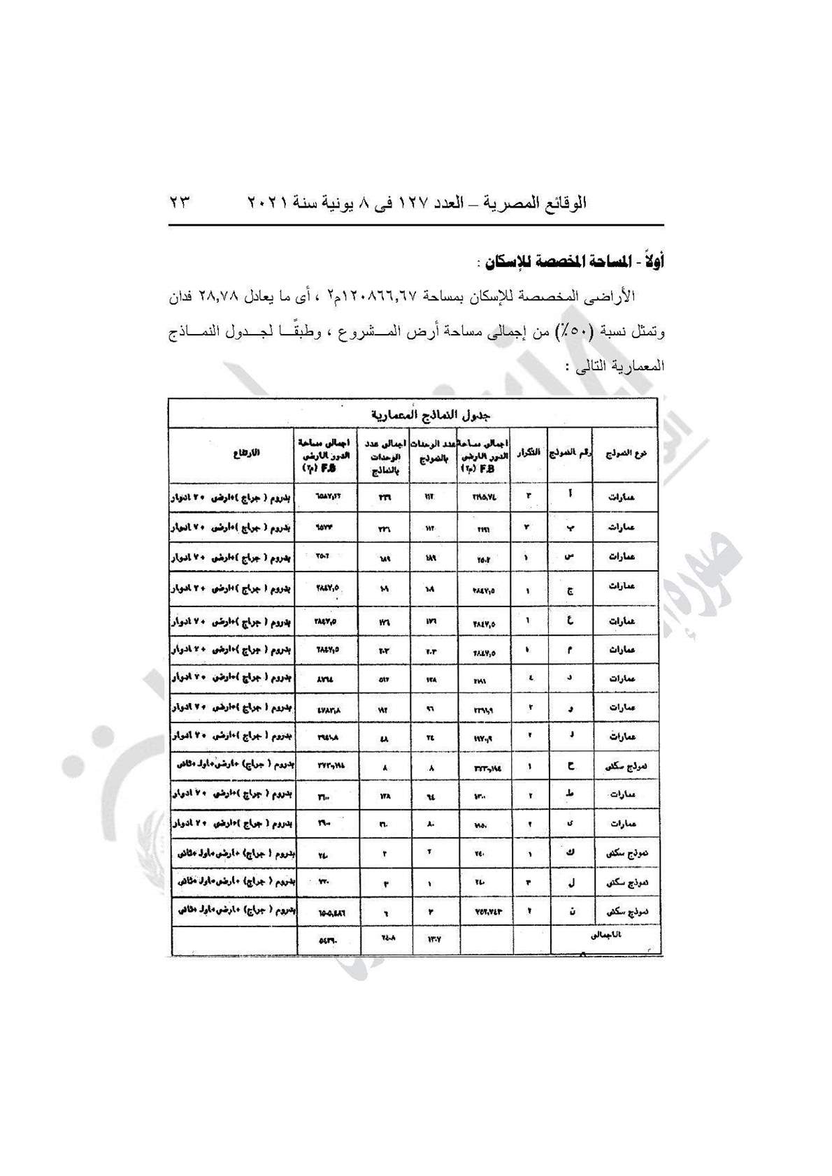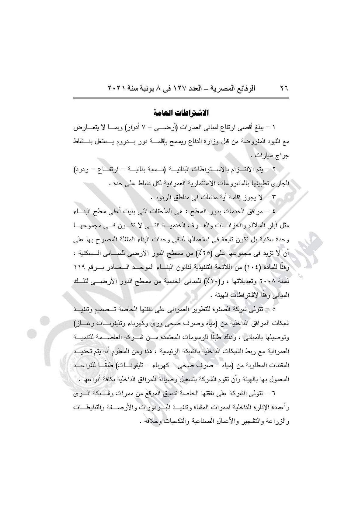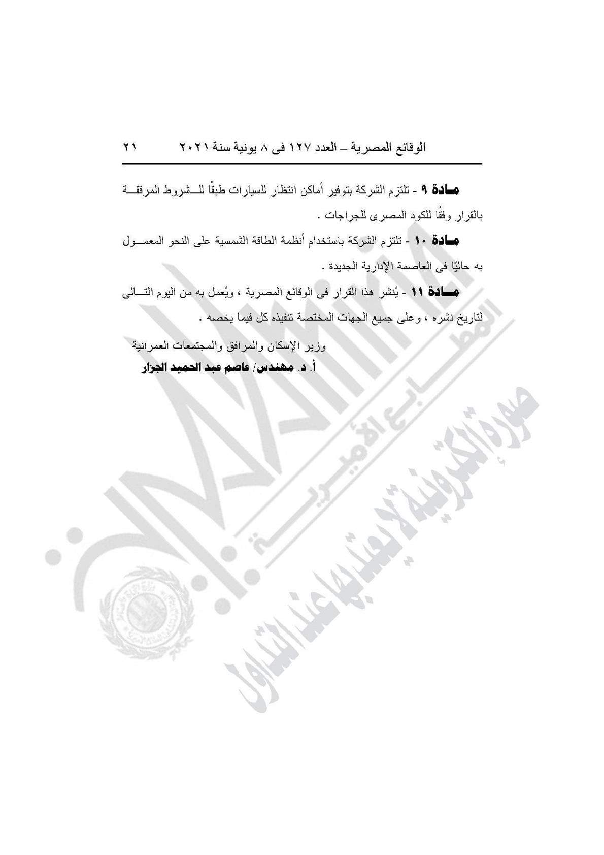 نشرت جريدة الوقائع المصرية في عددها رقم 127، الصادر في 8 يونيو 2021، قرارين لوزارة الإسكان والمرافق والمجتمعات العمرانية، بشأن اعتماد تعديل تخطيط مشروع عمرانى متكامل بالعاصمة الإدارية الجديدة. وإضافة مادة جديدة إلى اللائحة التنفيذية لقانون البناء.