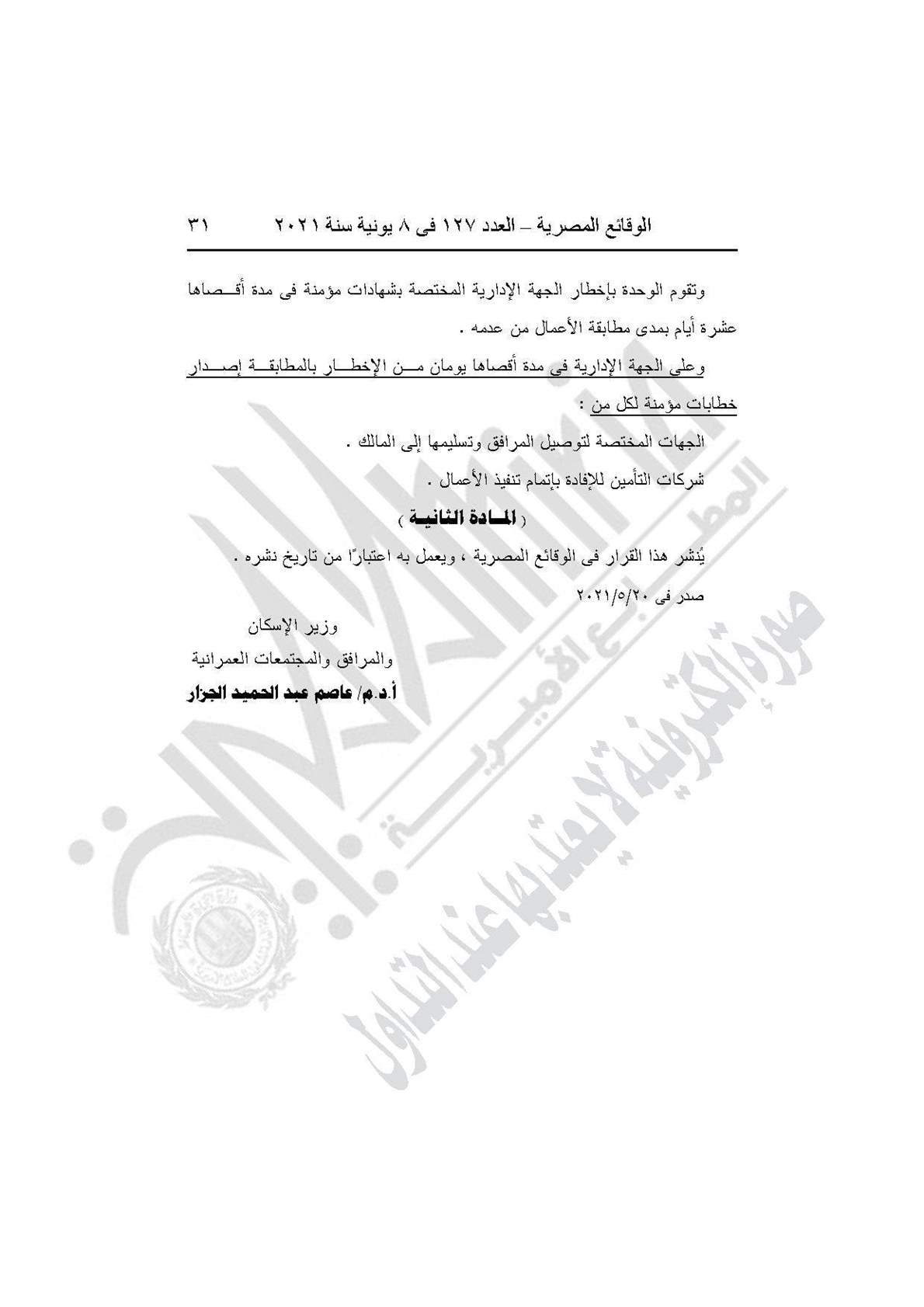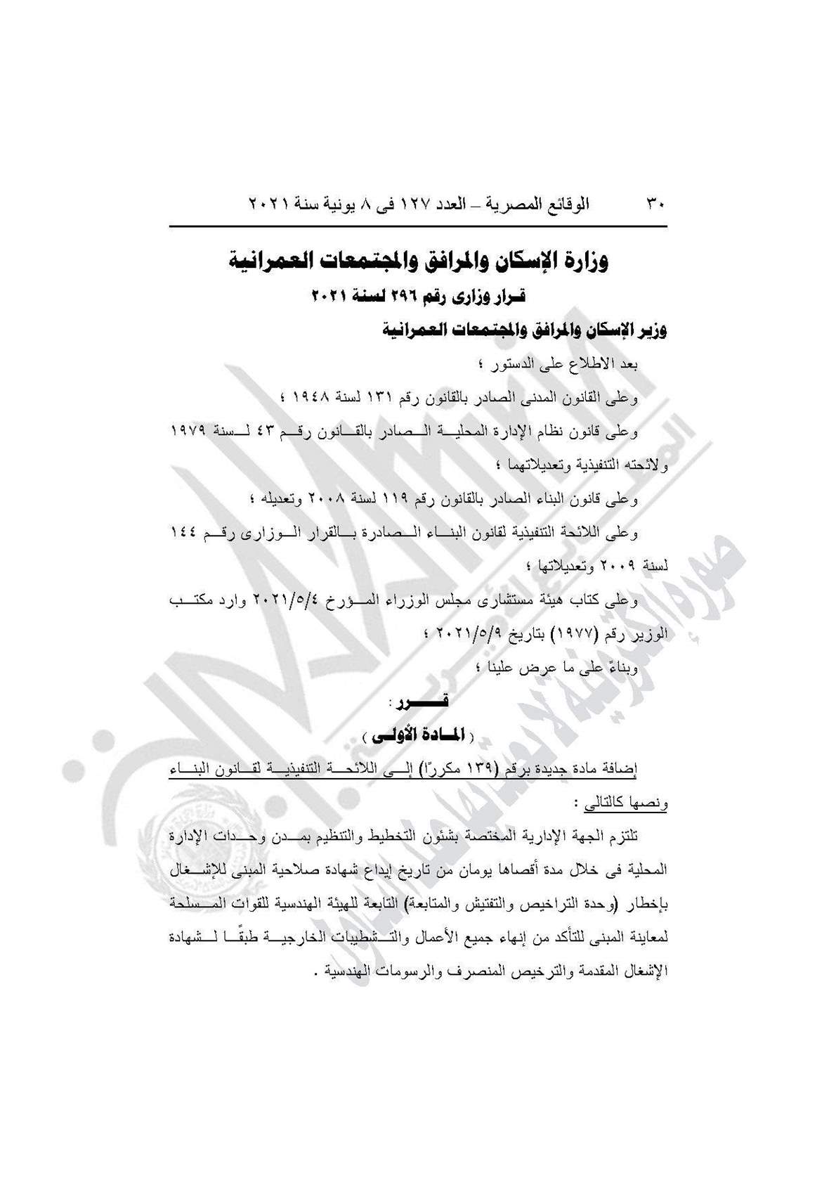 والقرار رقم 296 لسنة 2021، بشأن إضافة مادة جديدة برقم (139 مكررًا) إلى اللائحة التنفيذية لقانون البناء ونصها كالتالى: تلتزم الجهة الإدارية المختصة بشئون التخطيط والتنظيم بمدن وحدات الإدارة المحلية فى خلال مدة أقصاها يومان من تاريخ إيداع شهادة صلاحية المبنى للإشغال بإخطار (وحدة التراخيص والتفتيش والمتابعة) التابعة للهيئة الهندسية للقوات المسلحة لمعاينة المبنى للتأكد من إنهاء جميع الأعمال والتشطيبات الخارجية طبقًا لشهادة الإشغال المقدمة والترخيص المنصرف والرسومات الهندسية.