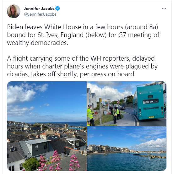 وكتبت جنيفر جاكوب مراسلة بلومبيرج في البيت الأبيض والمرافقة لرحلة الرئيس الأمريكي بايدن عبر تويتر: "يغادر بايدن البيت الأبيض في غضون ساعات قليلة (حوالي الساعة الثامنة صباحًا بتوقيت الولايات المتحدة الأمريكية) متجهًا إلى سانت آيفز، بإنجلترا لحضور اجتماع مجموعة الدول السبع الصناعية".