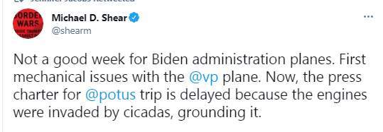 أما مايكل دي شير مراسل نيويورك تايمز بالبيت الأبيض فقال "إن هذا الأسبوع لم يكن جيدًا لطائرات إدارة بايدن.. فكانت المشكلات الميكانيكية الأولى مع طائرة نائب الرئيس الأمريكي كاميلا هاريس والآن طائرة إعلاميي الرئاسة الأمريكية بالبيت الأبيض.. وتم تأجيل الرحلة لأن المحركات تم غزوها بواسطة السيكادا، مما أدى إلى هبوطها".
