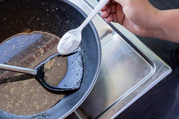 الطريقة: يُسكب صودا الخبز والماء في المقلاة ويُترك على نار خفيفة لمدة نصف ساعة تقريبًا، بعد ذلك اتركيه منقوعاً طوال الليل وافركي المقلاة في الصباح.
