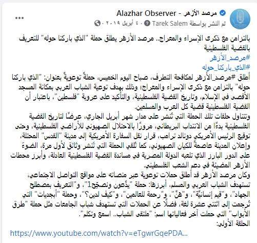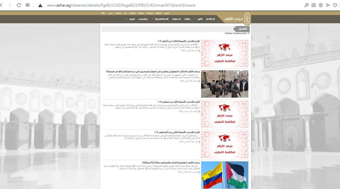 مرصد الأزهر لمكافحة التطرفوانطلاقًا من كون مرصد الأزهر لمكافحة التطرف «عين الأزهر الناظرة إلى العالم»، فقد تحمّل مسئولية إعادة التوعية بالقضية الفلسطينية، والسعي الجادّ إلى الوصول بأبعاد القضية وملفاتها الشائكة إلى أكبر عددٍ ممكن من قطاع الشباب، سواء عبر تنوع المحتوى وأسلوبه أو عبر اتّباع الوسائل الرقمية الحديثة، واستثمار منصات التواصل الاجتماعي لتكون منارةً لنشر تفكيرٍ عربيٍ وإسلاميٍ جديدٍ يتمحور حول عروبة القدس، وحرمة المقدسات الإسلامية والمسيحية، وتبعيتها لأصحابها، وقد تمثّل هذا عبر عدة محاور من عمل المرصد.