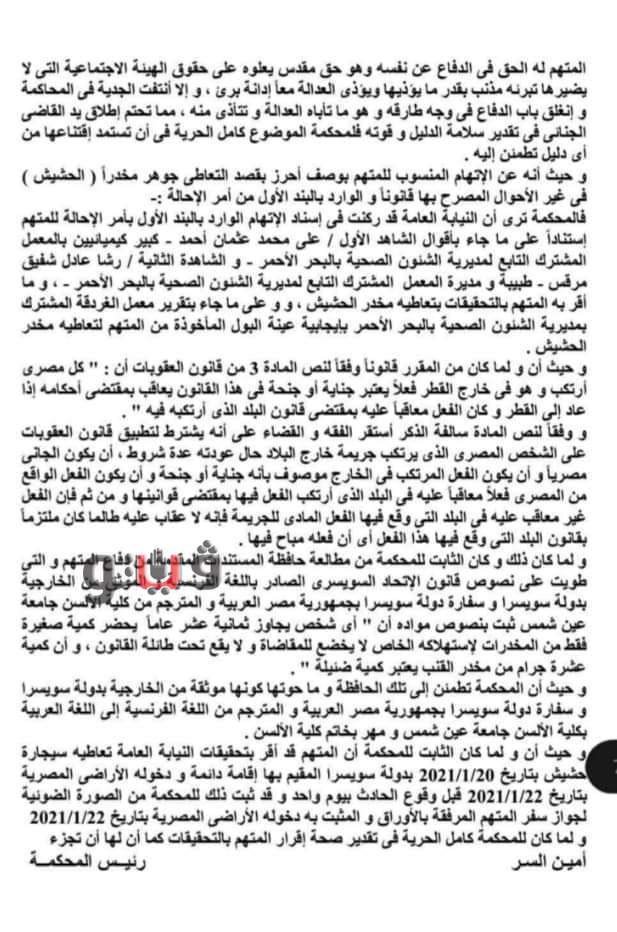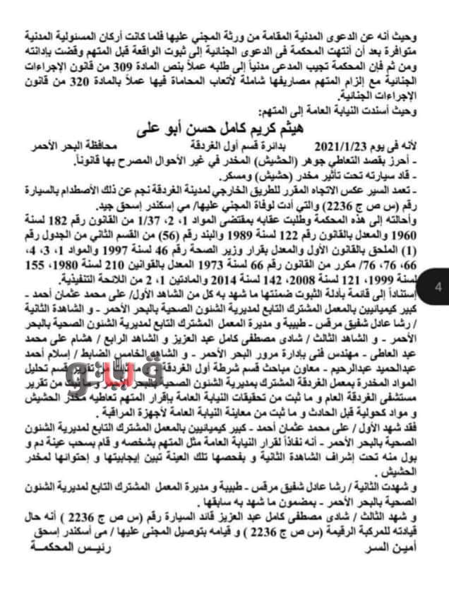 وقالت المحكمة في حيثيات حكمها التي تنفرد فيتو بنشره في القضية رقم 2001 لسنة 2021 أول الغردقة والمقيدة برقم 29 لسنة 2021 كلي البحر الأحمر ضد هثيم كريم کامل حسن أبو على حيث أكدت أنه حضر المتهم وحضر عصام على محمد حفناوي المحامي عن والده المجني عليها زاهية الفونس بولس وداليا إسكندر إسحق شقيقة المجني عليها بتوكيل عام رقم 328 م لسنة 2021 وادعيا مدنيا قبل المتهم بمبلغ مليون جنيه تعويض ماديا لما أصابه من أضرار مادية وأدبية وحضر معه للدفاع الدكتور محمد مصطفي حسين المحامي الموكل اتهمت النيابة العامة المذكور لأنه في يوم ۲۰۲۱/۱/۲۳ بدائرة قسم أول الغردقة محافظة البحر الأحمر أحرز بقصد التعاطي جوهر ( الحشيش المخدر في غير الأحوال المصرح بها قانونا كما تسبب خطأ في قتل المجني عليها مي إسكندر إسحق جيد وكان ذلك ناشئة عن إهماله ورعونته وعدم احترازه وعدم مراعاته للقوانين واللوائح بأن قاد سيارته رقم ج ر أ 3089عكس اتجاه السير المقرر وكان واقعا تحت تأثير مخدر الحشيش ومسكر فاصطدم بالسيارة الرقيمة س ص ج 2239 استقلال المجني عليها فأحدث بها و الإصابات الثابتة بالتقرير الطبي المرفق والتي أودت بحياتها على النحو المبين بالتحقيقات
