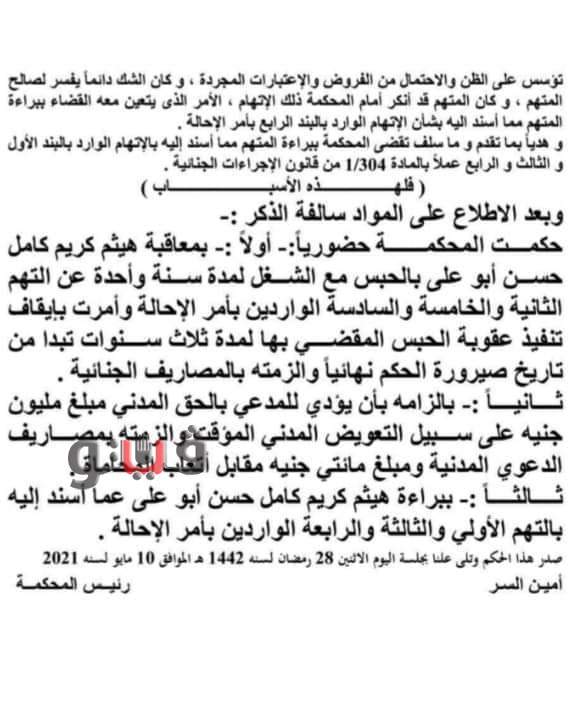 أودعت محكمة جنايات البحر الأحمر بـ سفاجا حيثيات حكمها بمعاقبة هيثم كريم كامل كامل أبو علي بالحبس مع الشغل لمدة سنة واحدة عن التهم الثانية والخامسة والسادسة الواردين بأمر الإحالة وأمرت بإيقاف تنفيذ عقوبة الحبس المقضي بها لمدة ثلاث سنوات تبدأ من تاريخ صيرورة الحكم نهائيا وألزمته بالمصاريف الجنائية.