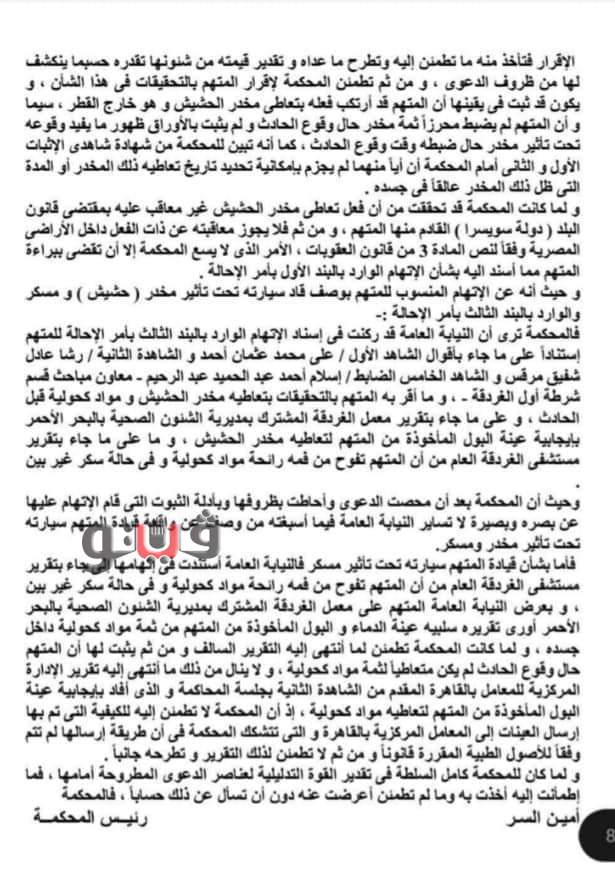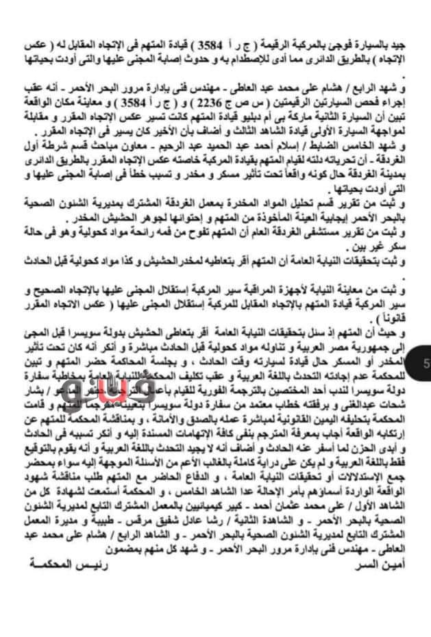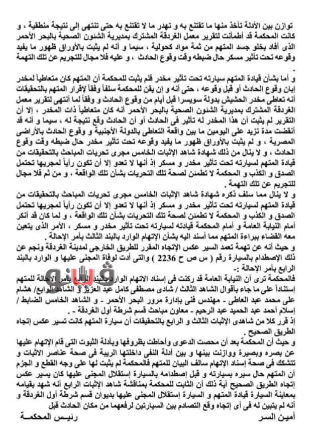 وقالت الحيثيات: إن وقائع الدعوى حسبما استقرت في يقين المحكمة مستخلصة من سائر أوراقها وما تم فيها من تحقيقات وما دار بشأنها بجلسة المحاكمة تتحصل فيما سطره بمحضر جمع الاستدلالات المؤرخ 23 – 1 – 2021 الساعة الرابعة صباحا وشهد به بالتحقيقات الضابط خالد سمير حسن زکی – ضابط بقسم شرطة أول الغردقة – بأنه حال رئاسته دورية النجدة ورد إليه بلاغ من غرفة عمليات النجدة بوقوع حادث تصادم بالطريق الدائري بالقرب من منطقة السفاري في اتجاه الأحياء بدائرة قسم أول الغردقة، فانتقل لمكان الحادث وبوصوله أبصر سيارتين تم التصادم فيما بينهما وتبين له أن أطراف الحادث السيارة رقم (ج ر أ 3089) وحدة مرور الغردقة طوبي اللون قيادة المتهم/ هيثم كريم كامل حسن أبو على ويحمل رخصة تسيير سارية حتى 27 – 9 – 2021 والسيارة في حالة إنقلاب وبها تلفيات في معظم أجزائها.