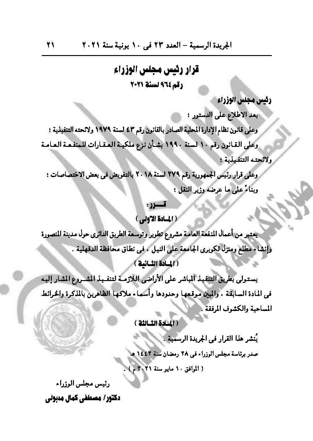 القرار رقم 964 لسنة 2021، باعتبار مشروع تطوير وتوسعة الطريق الدائري حول مدينة المنصورة وإنشاء مطلع ومنزل لكوبري الجامعة على النيل، في نطاق محافظة الدقهلية من أعمال المنفعة العامة.