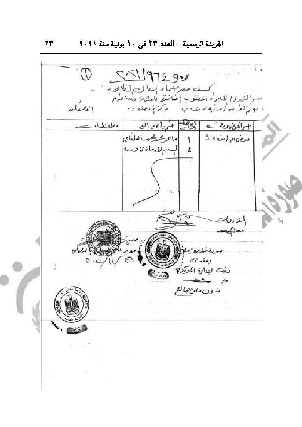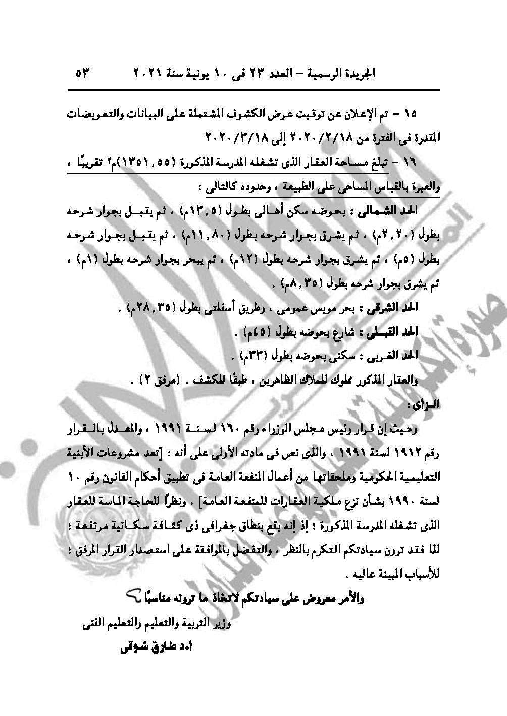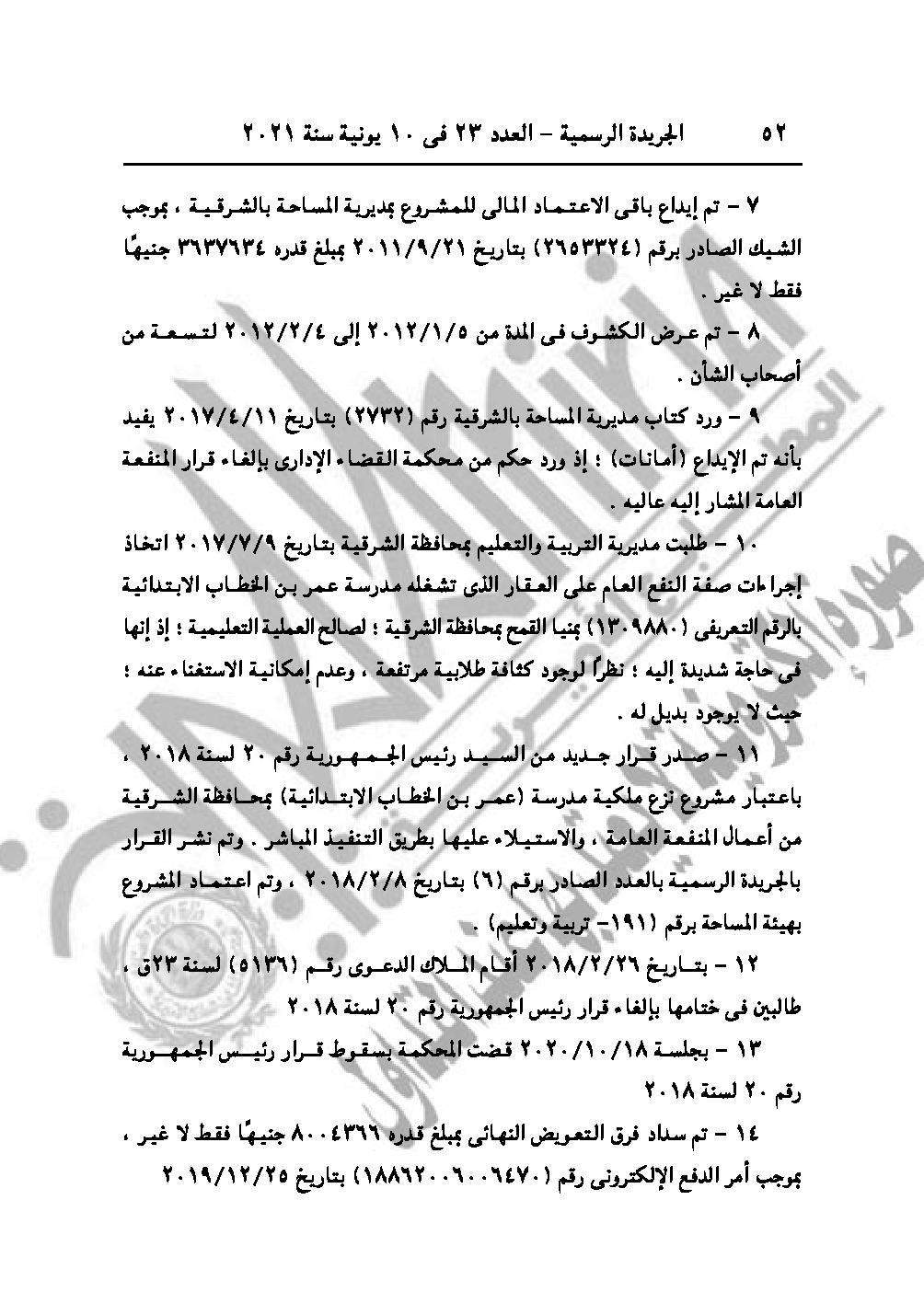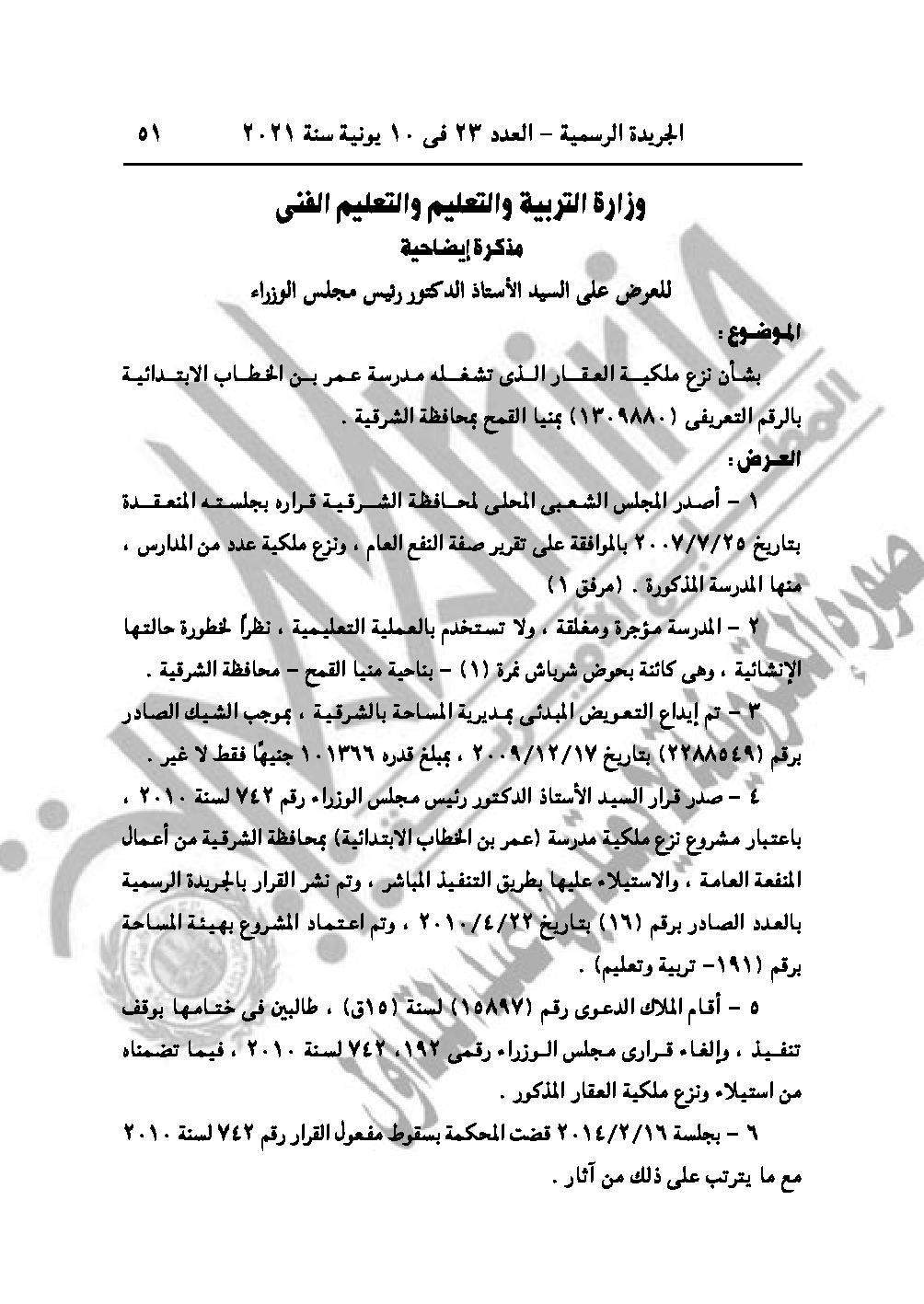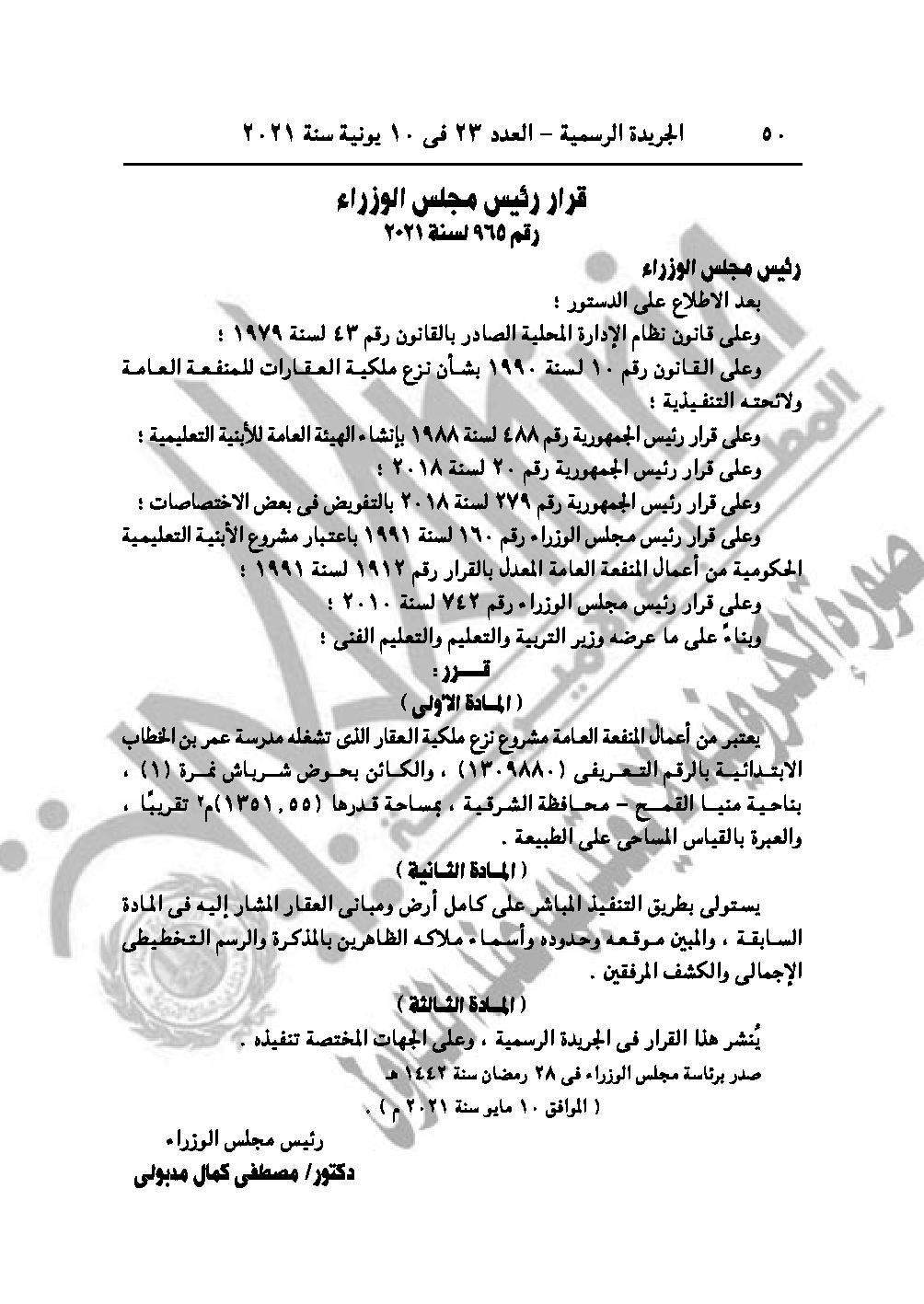 والقرار رقم 965 لسنة 2021، باعتبار مشروع نزع ملكية العقار الذي تشغله مدرسة عمر بن الخطاب الابتدائية ناحية منيا القمح محافظة الشرقية، من أعمال المنفعة العامة.