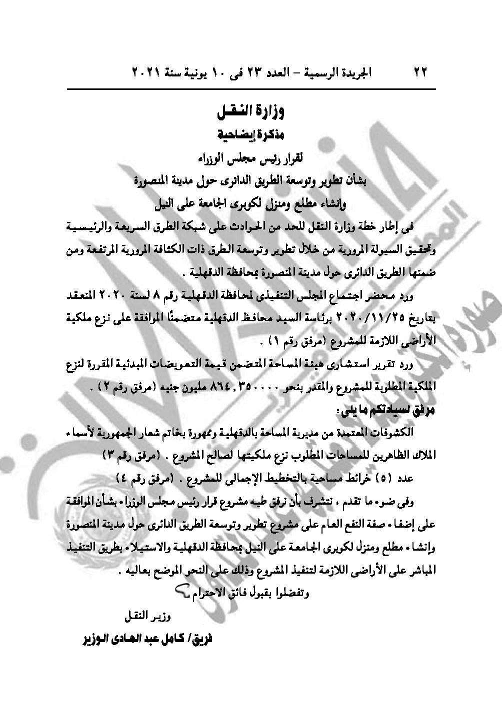 نشرت الجريدة الرسمية في عددها رقم 23، الصادر في 10 يونية سنة 2021، قرارى رئيس مجلس الوزراء الدكتور مصطفى مدبولي باعتبار مشروع تطوير وتوسعة الطريق الدائري حول مدينة المنصورة ومطلع ومنزل لكوبري الجامعة بالدقهلية، و مشروع نزع ملكية العقار الذي تشغله مدرسة عمر بن الخطاب الابتدائية ناحية منيا القمح بالشرقية من أعمال المنفعة العامة.