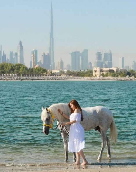 وظهرت طافش في الصورة وهي داخل المياه في أحد المسابح المرتفعة في برج دبي، وتنظر باتجاه النافذة.