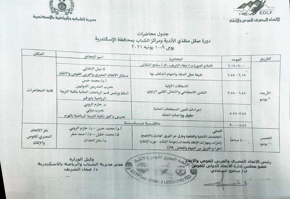ويبدأ غدا اليوم الثاني للدورة بتدريب عملي بمقر اتحاد الغوص والإنقاذ وتأتي هذه الدورة ضمن فاعليات مبادرة مصر بلا غرقى.