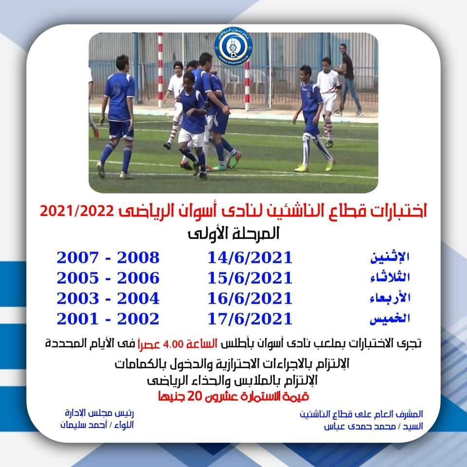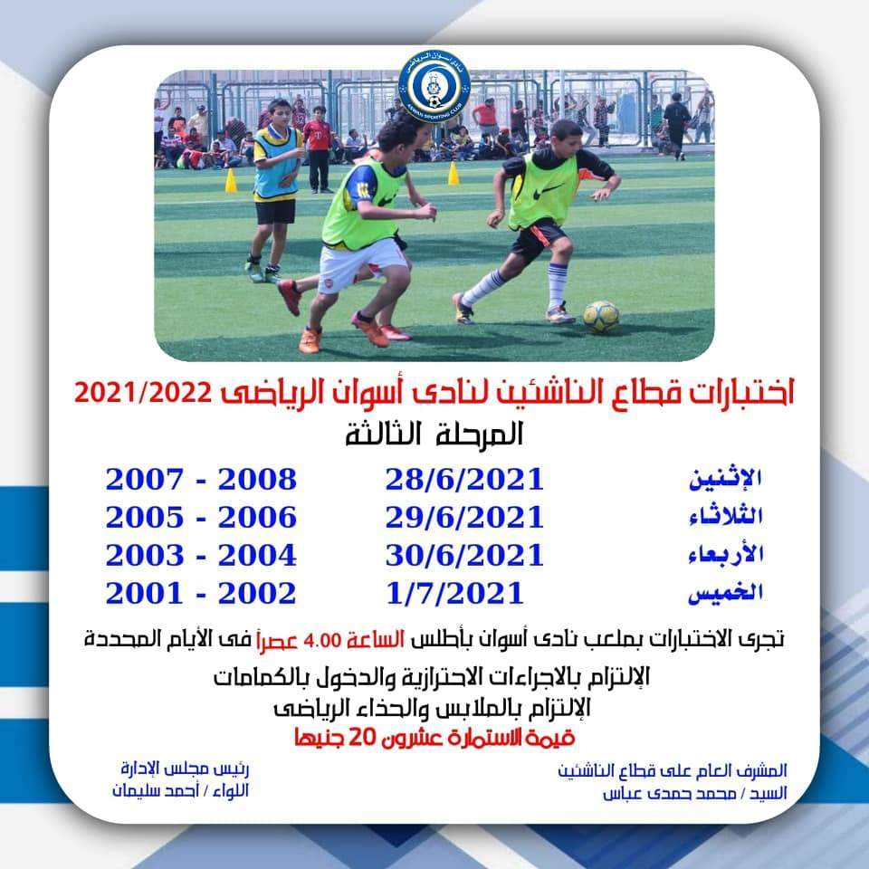 وأكد نادي أسوان إقامة اختبارات قطاع الناشئين لكرة القدم بنادي أسوان الرياضي موسم 2021/2022، على ثلاث مراحل.