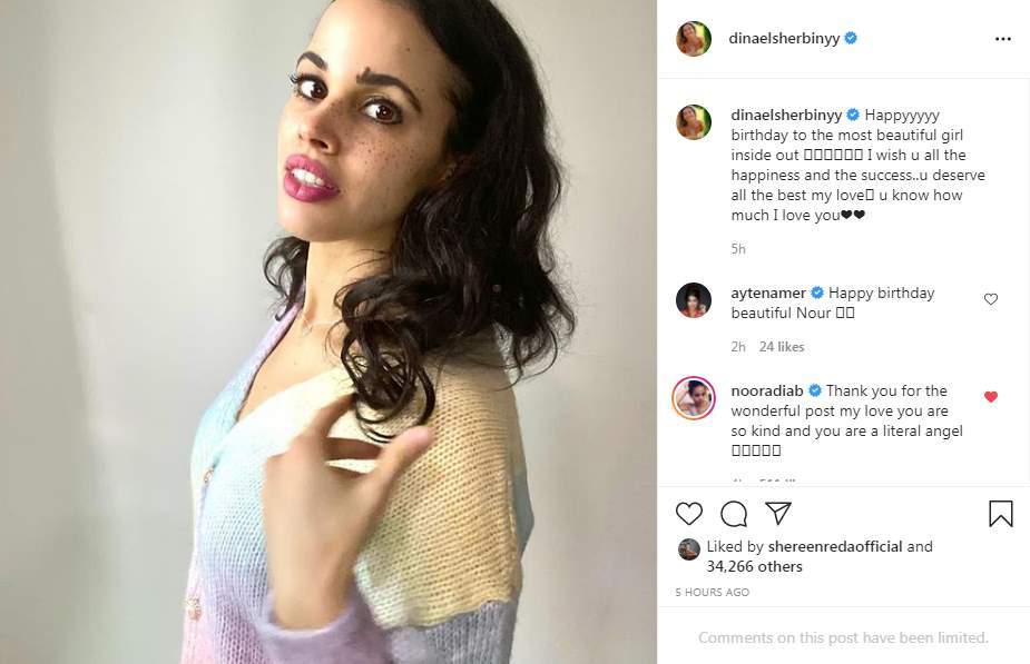 ونشرت دينا الشربيني على صفحتها الشخصية بموقع الصور الشهير "انستجرام" صورة لنور ابنة المطرب عمرو دياب معلقة: "عيد ميلاد سعيد لأجمل فتاة في الخارج أتمنى لك كل السعادة والتوفيق.. أنت تستحق كل التوفيق حبيبي أنت تعرف كم أحبك".