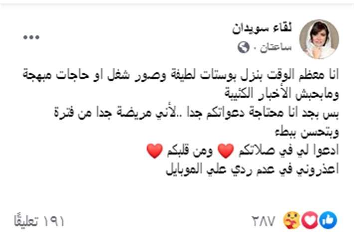 ونشرت "لقاء"، عبر حسابها الرسمي على موقع التواصل الإجتماعي "فيس بوك" صورة لها معلقه بقولها :"أنا طول الوقت بنزل بوستات لطيفة وصور شغل أو حاجات مبهجة ومبحبش الأخبار الكئيبة، بس بجد أنا محتاجة دعواتكم جدا لأني مريضة جداً من فترة وبتحسن ببطء، ادعولي في صلاتكم ومن قلبكم، أعذروني في عدم ردي على موبايلي".