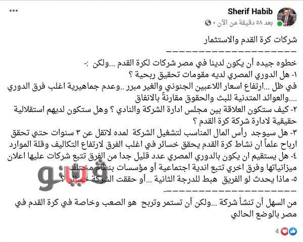 وأكد شريف حبيب عبر صفحته علي موقع التواصل الاجتماعي فيس بوك :"من السهل أن تنشأ شركة ...ولكن أن تستمر وتربح هو الصعب وخاصة في كرة القدم في مصر بالوضع الحالي".