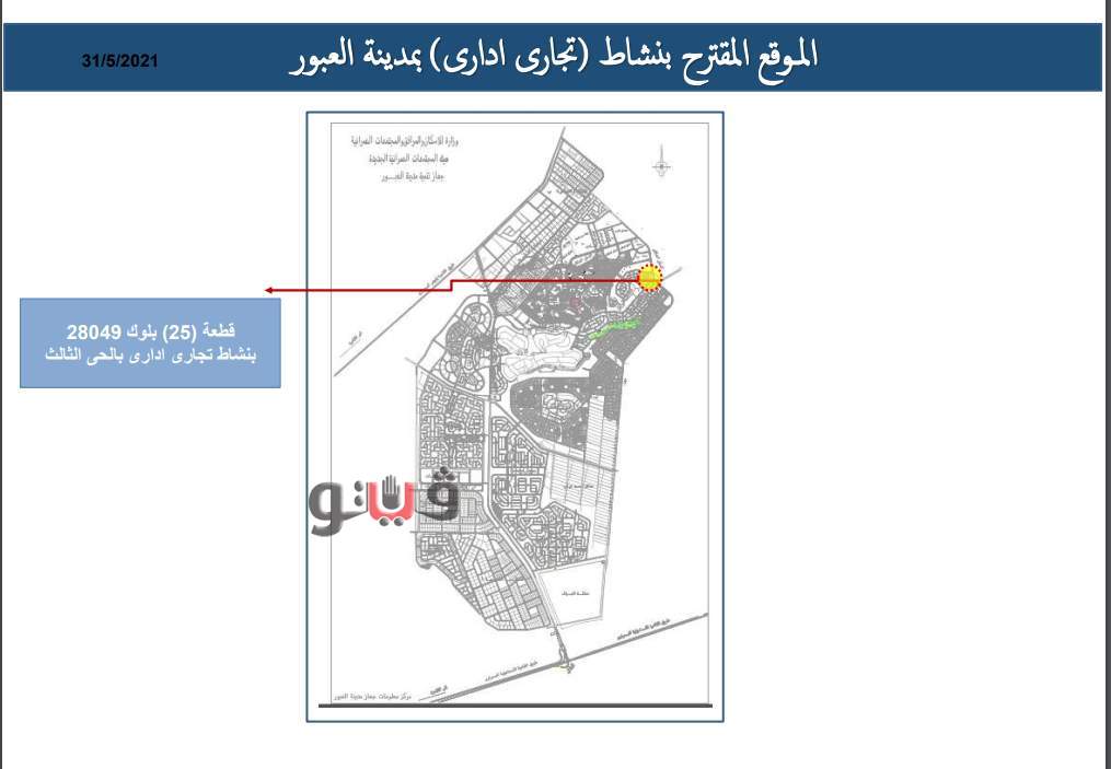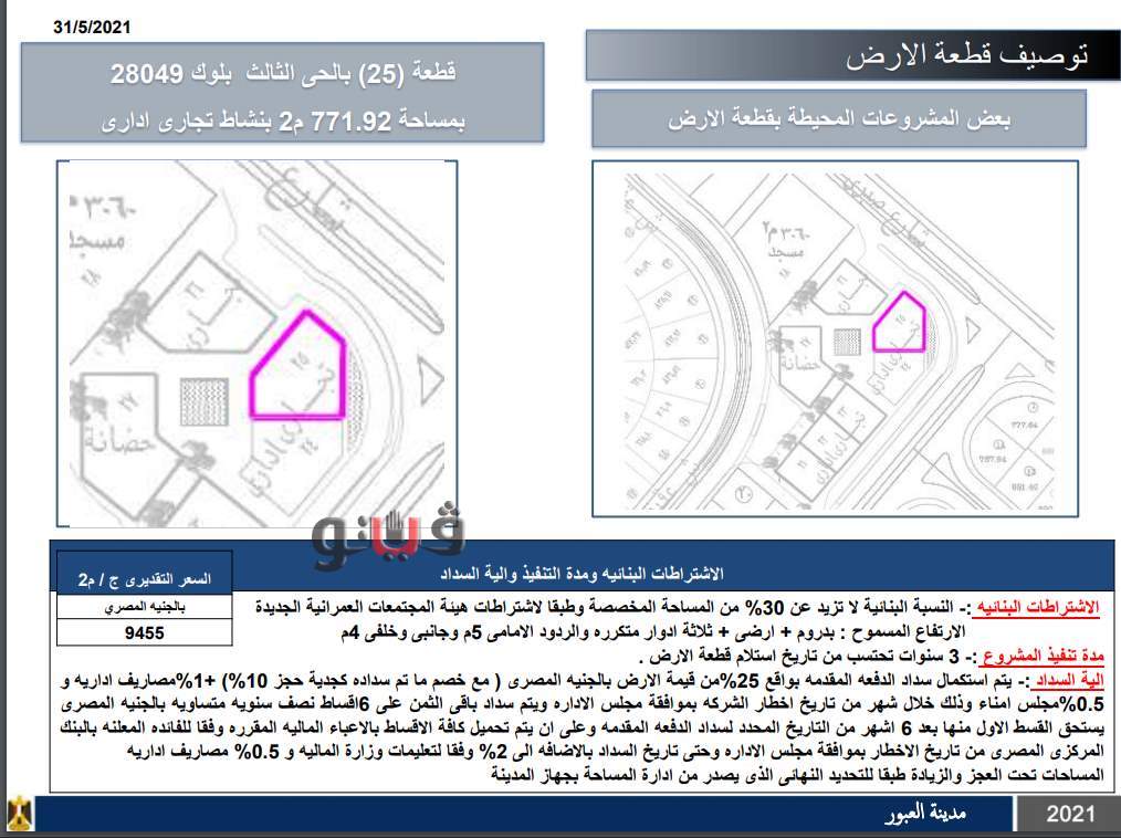 في مدينة العبور طرحت الوزارة أراض تجاري واداري بمساحة ٧٧١.٩ متر بسعر ٩٤٥٥ جنيه للمتر بقيمة ٧.٢ مليون جنيه.