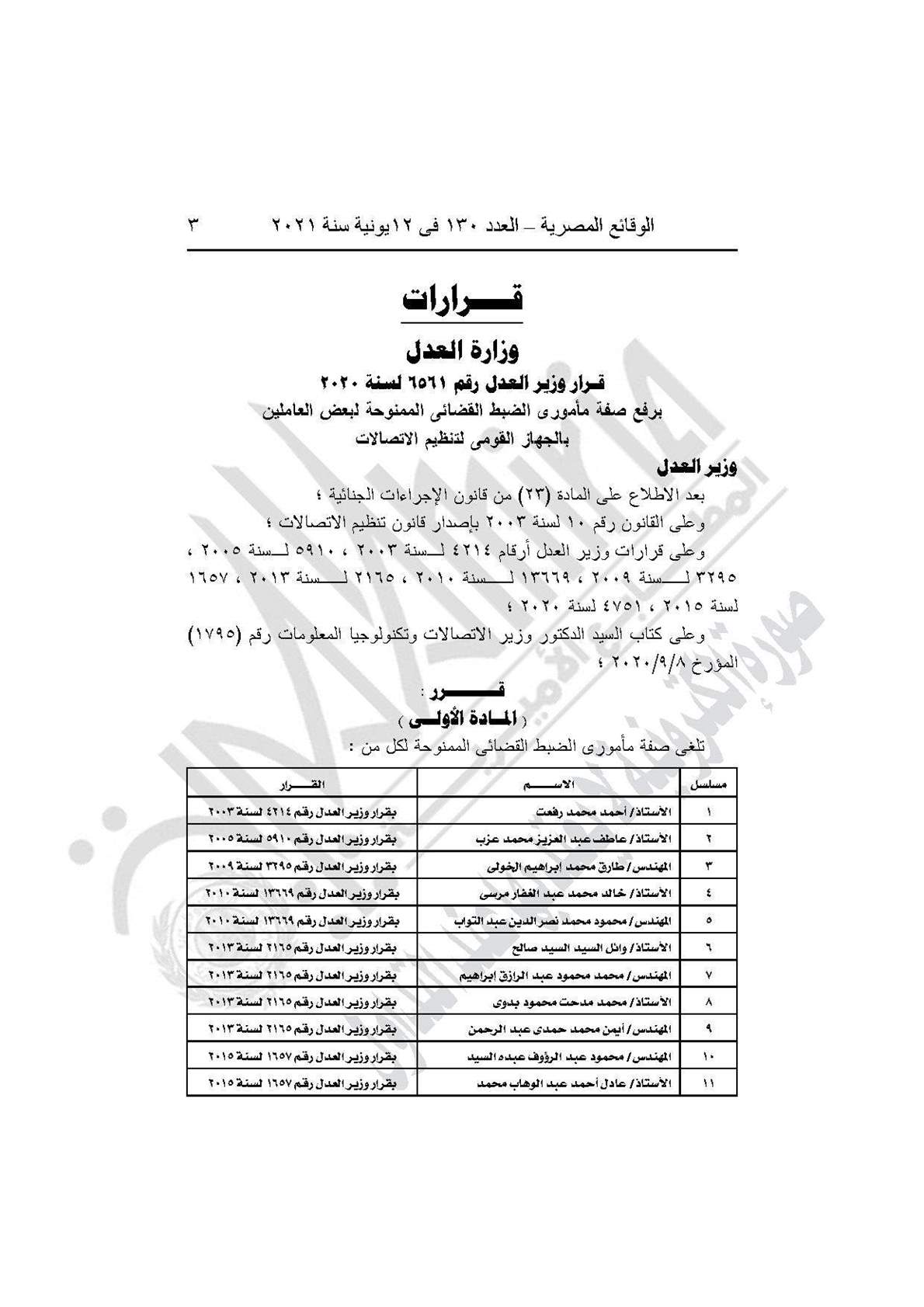 - القرار رقم 6561 لسنة 2020، بشأن برفع صفة مأموري الضبط القضائي الممنوحة لبعض العاملين بالجهاز القومي لتنظيم الاتصالات.