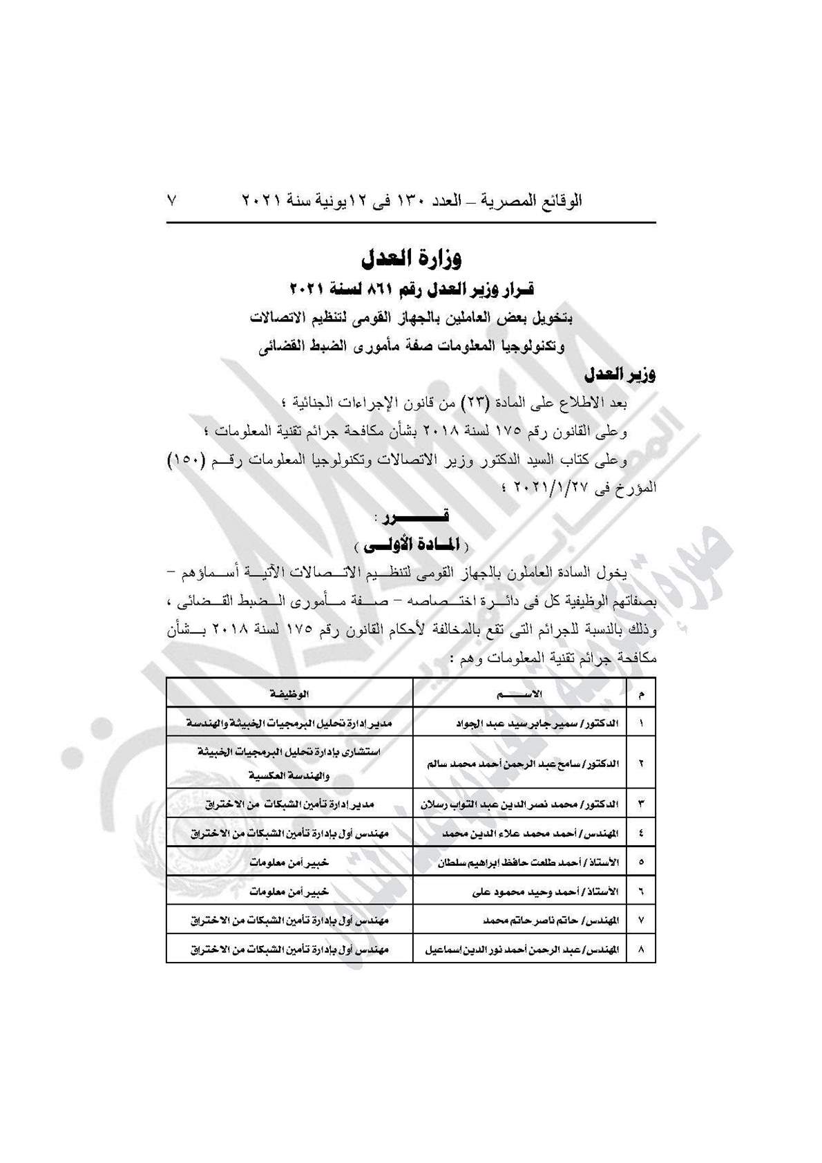 -القرار رقم 861 لسنة 2021، بتخويل بعض العاملين بالجهاز القومي لتنظيم الاتصالات وتكنولوجيا المعلومات صفة مأموري الضبط القضائي.