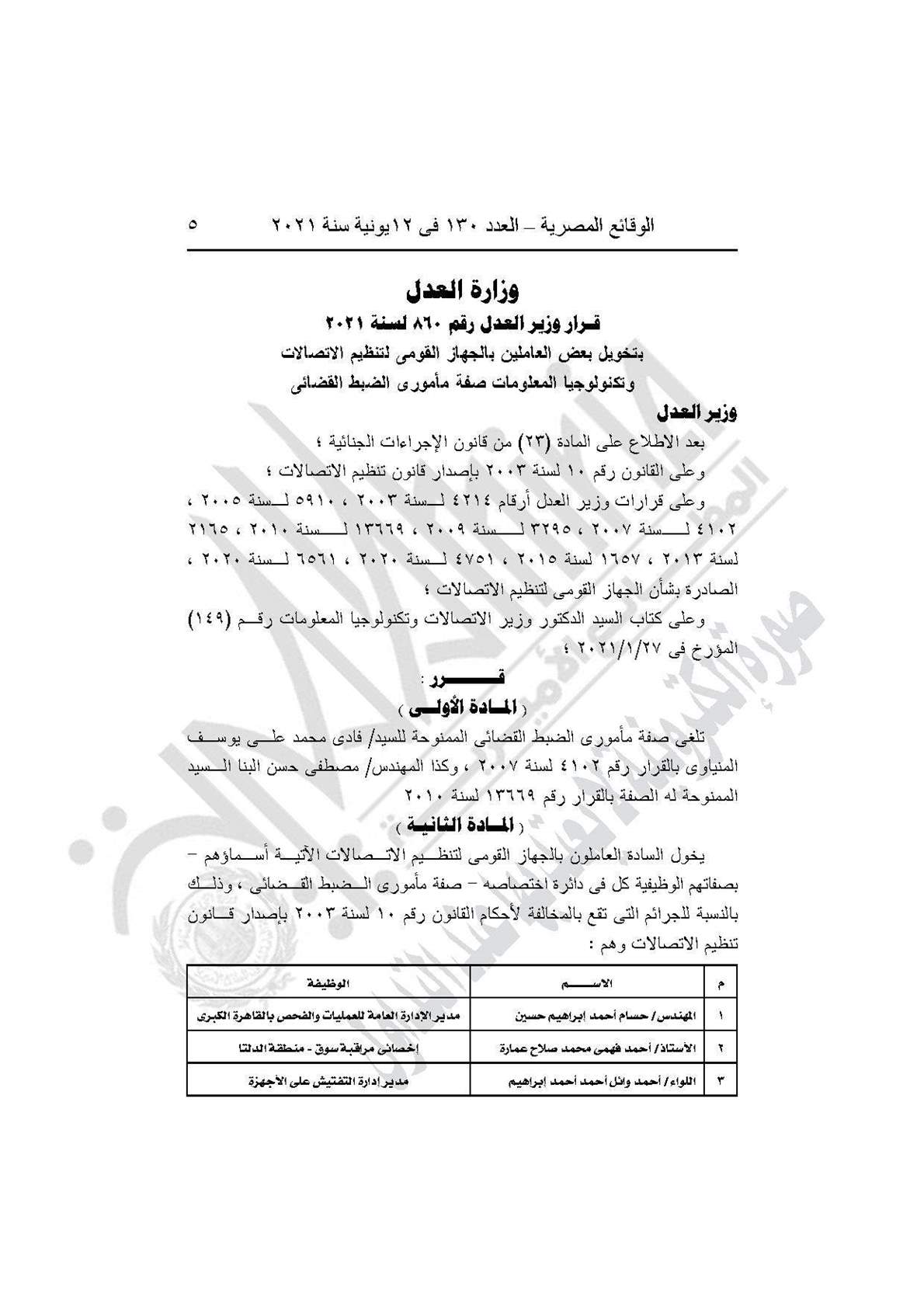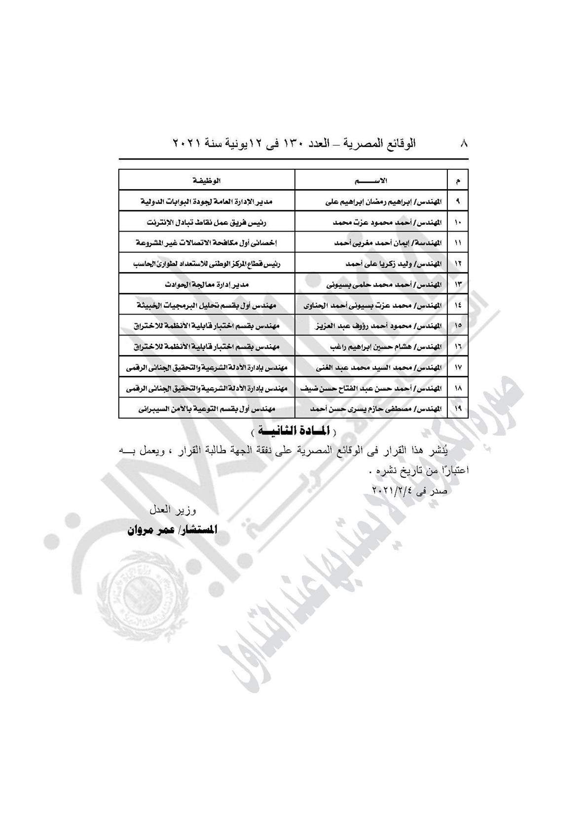 نشرت جريدة الوقائع المصرية في عددها رقم 130، الصادر في 12 يونية 2021، 4 قرارات لوزير العدل المستشار عمر مروان، بشأن منح مأمورية الضبط القضائي لبعض العاملين بالجهاز القومي لتنظيم الاتصالات وتكونولوجيا المعلومات، الموافقة على مزاولة أعمال المحاماة لأعضاء الإدارات القانونية بهيئة الدواء المصرية.