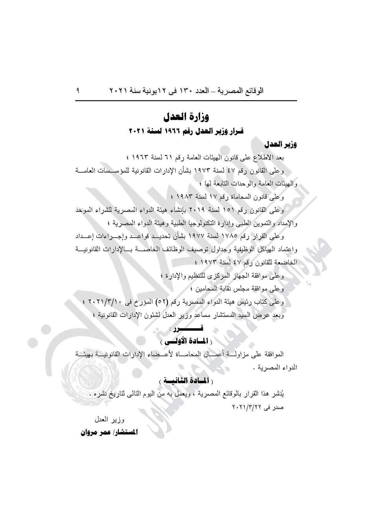 -القرار رقم 1966 لسنة 2021، بشأن الموافقة على مزاولة أعمال المحاماة لأعضاء الإدارات القانونية بهيئة الدواء المصرية.