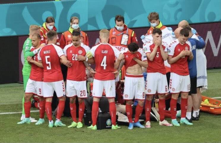 وكان قد تعرض كريستيان إريكسن لاعب ونجم منتخب الدنمارك للسقوط مغشيًا عليه دون تدخل من أحد، وقام الجهاز الطبي بمحاولات كبيرة لإفاقة اللاعب ووضح وجود مشكلات في قلب اللاعب، حيث قام الأطباء بالضغط على صدره وهي المحاولات التي تتم أثناء ضربات القلب الضعيفة أو المتوقفة.