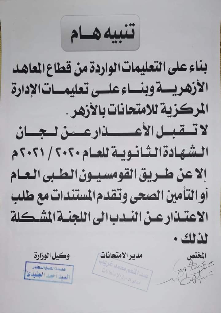 ومن جانبه عمم قطاع المعاهد الأزهرية تعليماته إلى كافة المناطق الأزهرية، بعدم قبول الأعذار عن لجان الشهادة الثانوية لهذا العام، إلا عن طريق القومسيون الطبي العام أو التأمين الصحى وتقدم المستندات مع طلب الاعتذار عن الندب إلى اللجنة المشكلة لذلك.