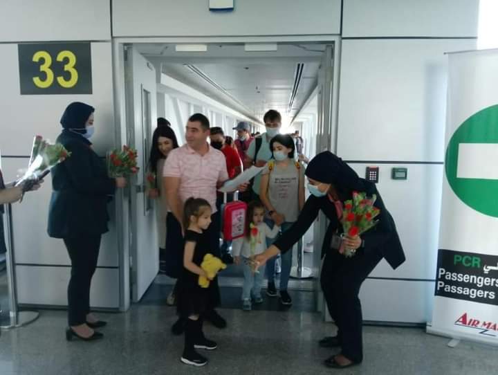 وقام فريق العلاقات العامة بالمطار بإستقبال الركاب بالورود و إنهاء كافة إجراءات الوصول الخاصة بهم بسهولة ويسر تام مع الالتزام بتطبيق كافة الإجراءات الإحترازية والوقائية المتبعة بالمطارات المصرية خلال جائحة كورونا للحفاظ على صحة المسافرين.