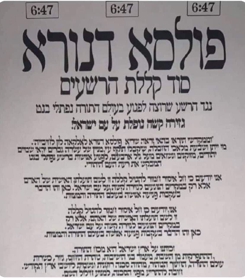 وأفادت القناة العبرية بأن ناشطين على مواقع التواصل الاجتماعي تداولوا منشور بعنوان "بولسا دي نورا" ضد نفتالي بينيت، وهي جملة تعني إنزال لعنة الشر على شخص شرير، وذلك بدعوى أن رئيس الوزراء المحتمل يقوم بأعمال شريرة ستضر بـ"عالم التوراة".