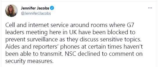 وكتبت جنيفر جاكوب تغريدة على تويتر "تم حظر خدمة الهاتف والإنترنت حول الغرف التي يجتمع فيها قادة مجموعة السبع هنا في المملكة المتحدة لمنع المراقبة أثناء مناقشة الموضوعات الحساسة. هواتف المساعدين والصحفيين في أوقات معينة لم تكن قادرة على الإرسال. وامتنع مجلس الأمن القومي عن التعليق على الإجراءات الأمنية"