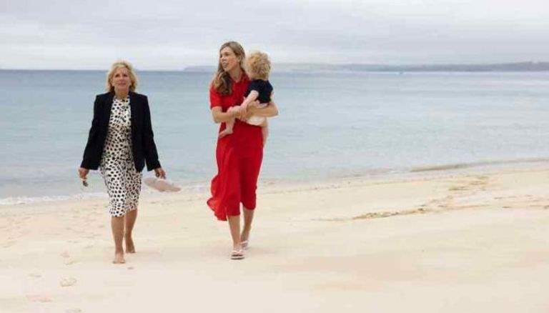 تجمع زعماء القوى السبع الكبرى في العالم وزوجاتهم في حفل شواء على شاطئ خليج كاربيس بإنجلترا، أمس السبت.