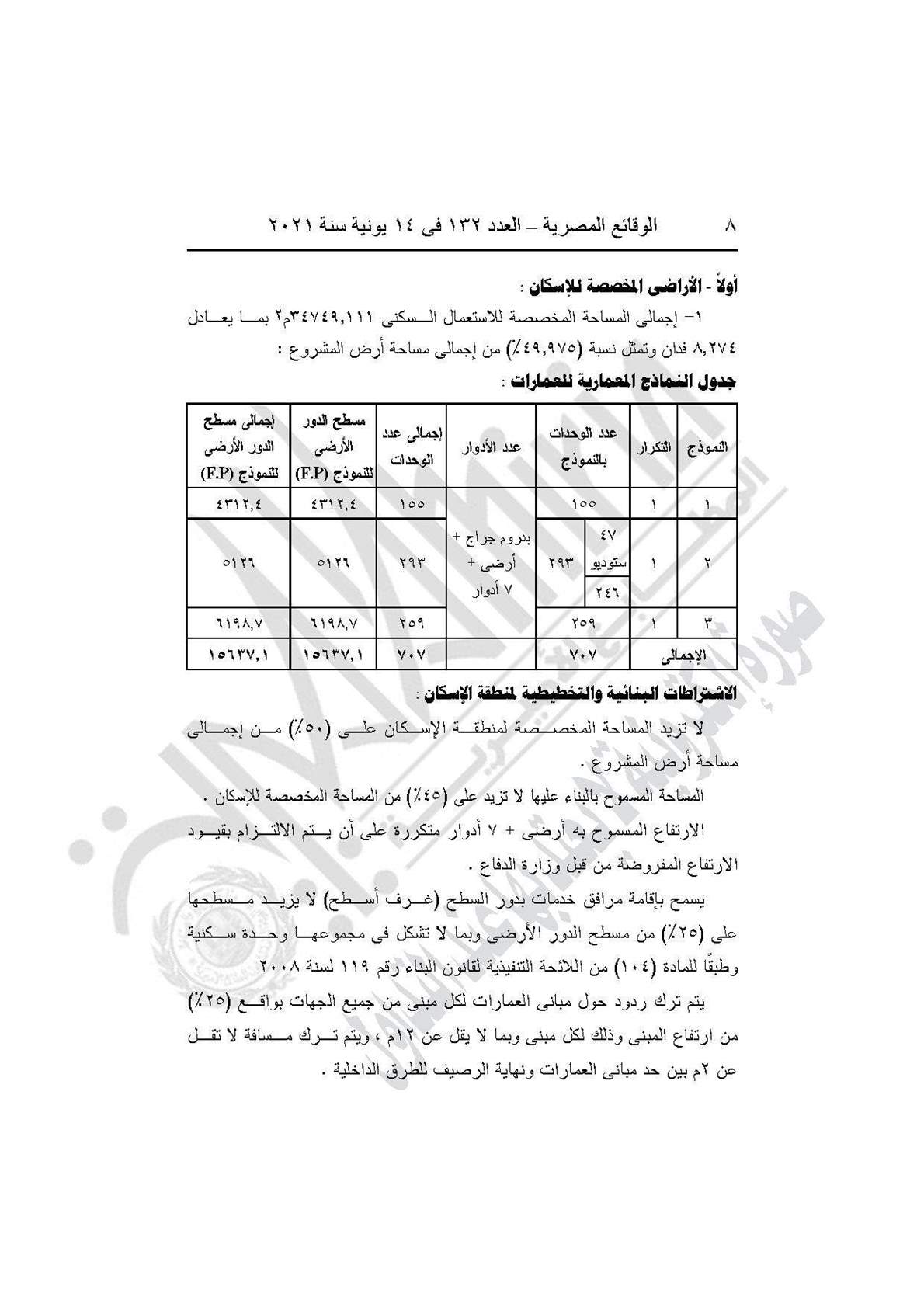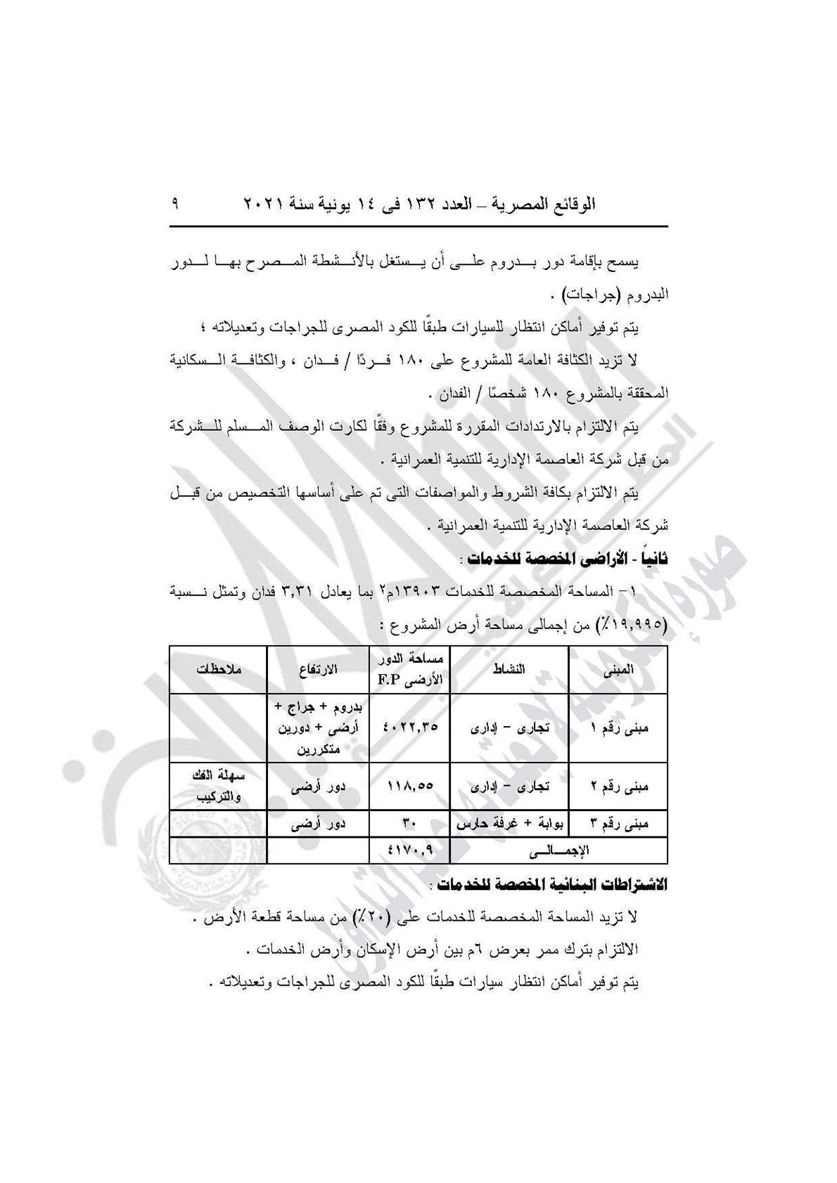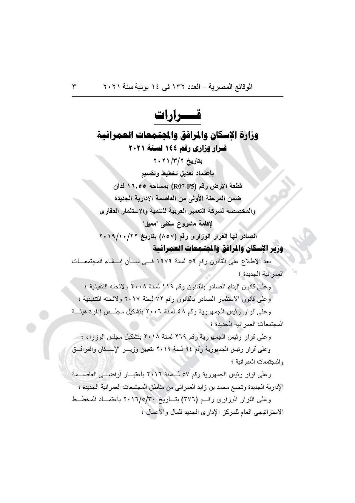نشرت جريدة الوقائع المصرية في عددها رقم 132، الصادر في 14 يونيو 2021، قرار وزارة الإسكان والمرافق والمجتمعات العمرانية رقم 144 لسنة 2021، بشأن اعتماد تعديل تخطيط وتقسيم قطعة الأرض رقم (R07-F5) بمساحة 16.55 فدان ضمن المرحلة الأولى من العاصمة الإدارية الجديدة، والمخصصة لشركة التعمير العربية للتنمية والاستثمار العقاري، لإقامة مشروع سكني مميز.