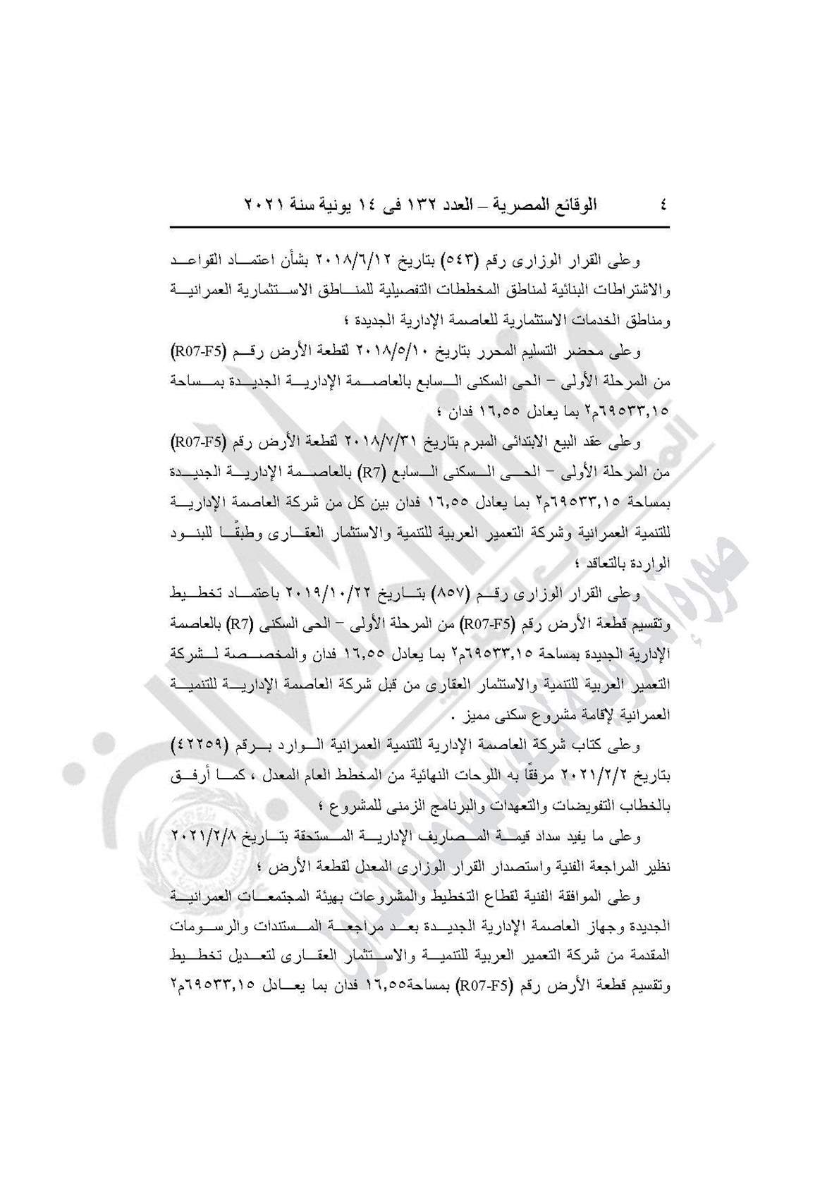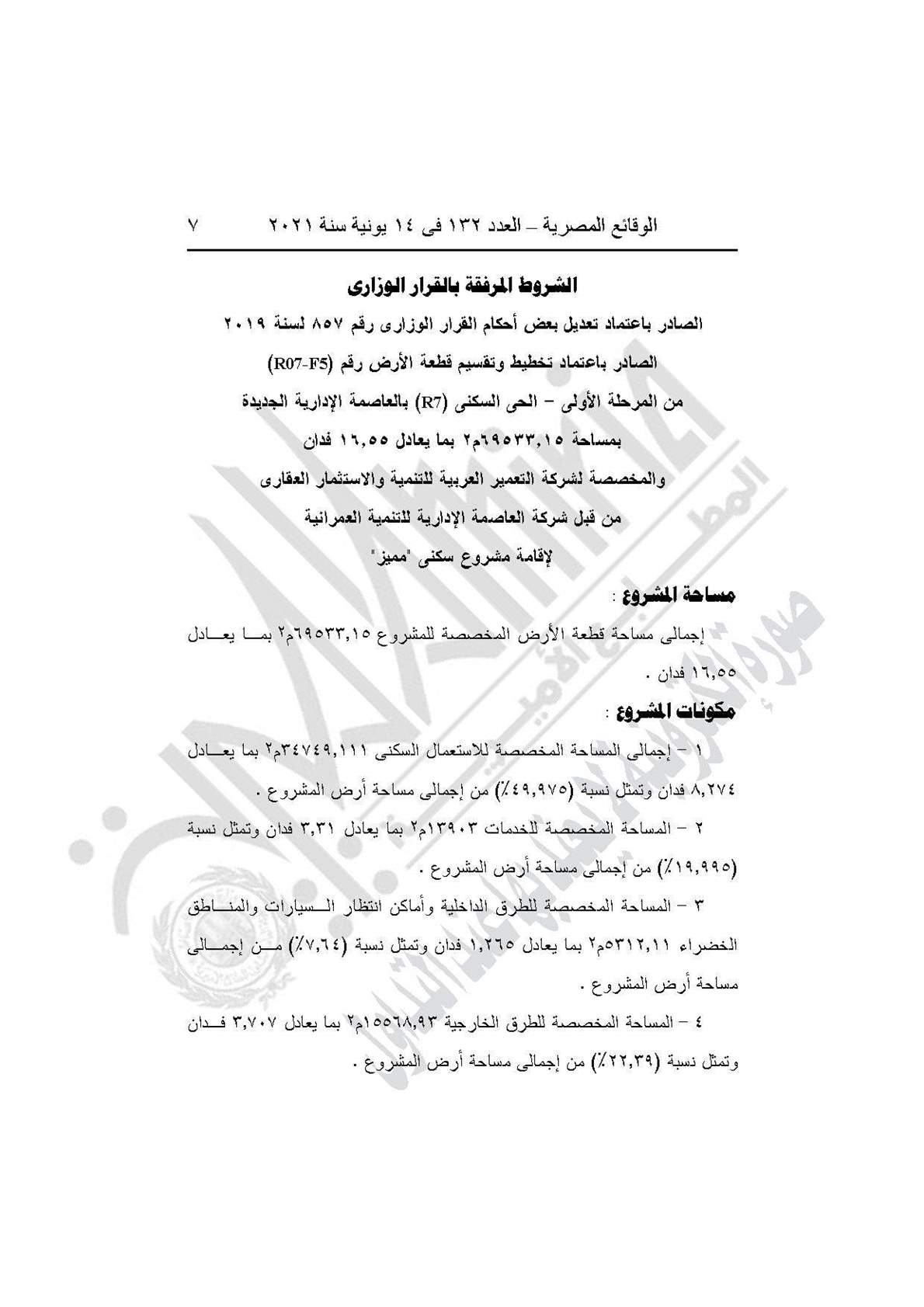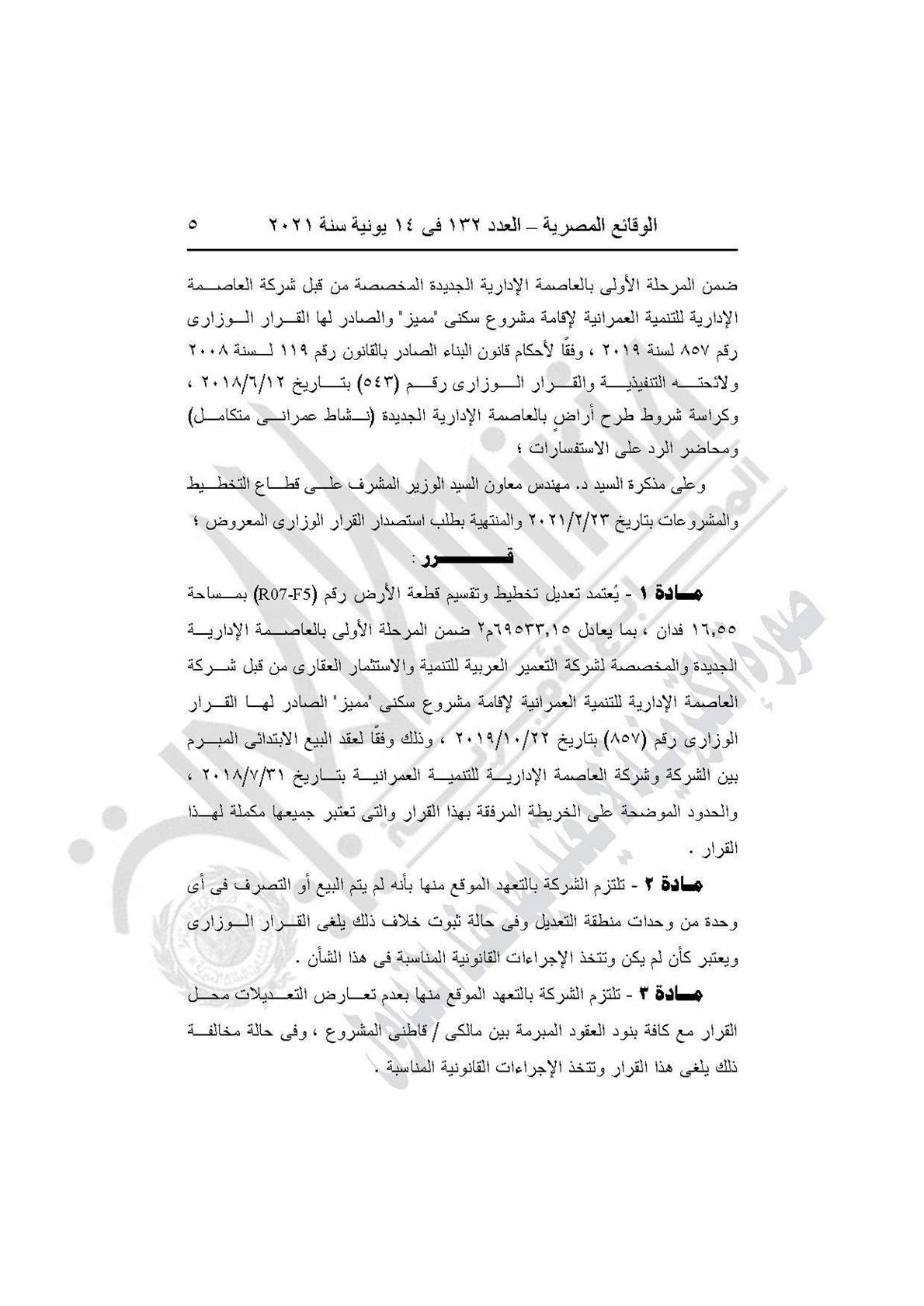 ونصت المادة الأولى من القرار على اعتماد تعديل وتقسيم قطعة الأرض رقم (R07-F5) بمساحة 16.55 فدان، بما يعادل 69533.15 متر مربع ضمن المرحلة الأولى بالعاصمة الإدارية الجديدة، والمخصصة لشركة التعمير العربية للتنمية والاستثمار العقاري من قبل شركة العاصمة الإدارية للتنمية العمرانية؛ لإقامة مشروع سكني "مميز"، الصدر لها القرار الوزاري (857) بتاريخ 22 /10 /2019، وذلك وفقًا لعقد البيع الابتدائي المبرم بين الشركة وشركة العاصمة الإدارية للتنمية العمرانية بتاريخ 31 /7 /2018.