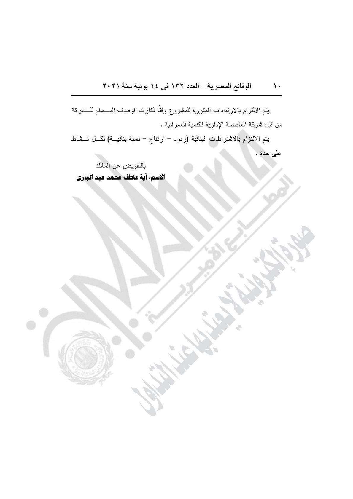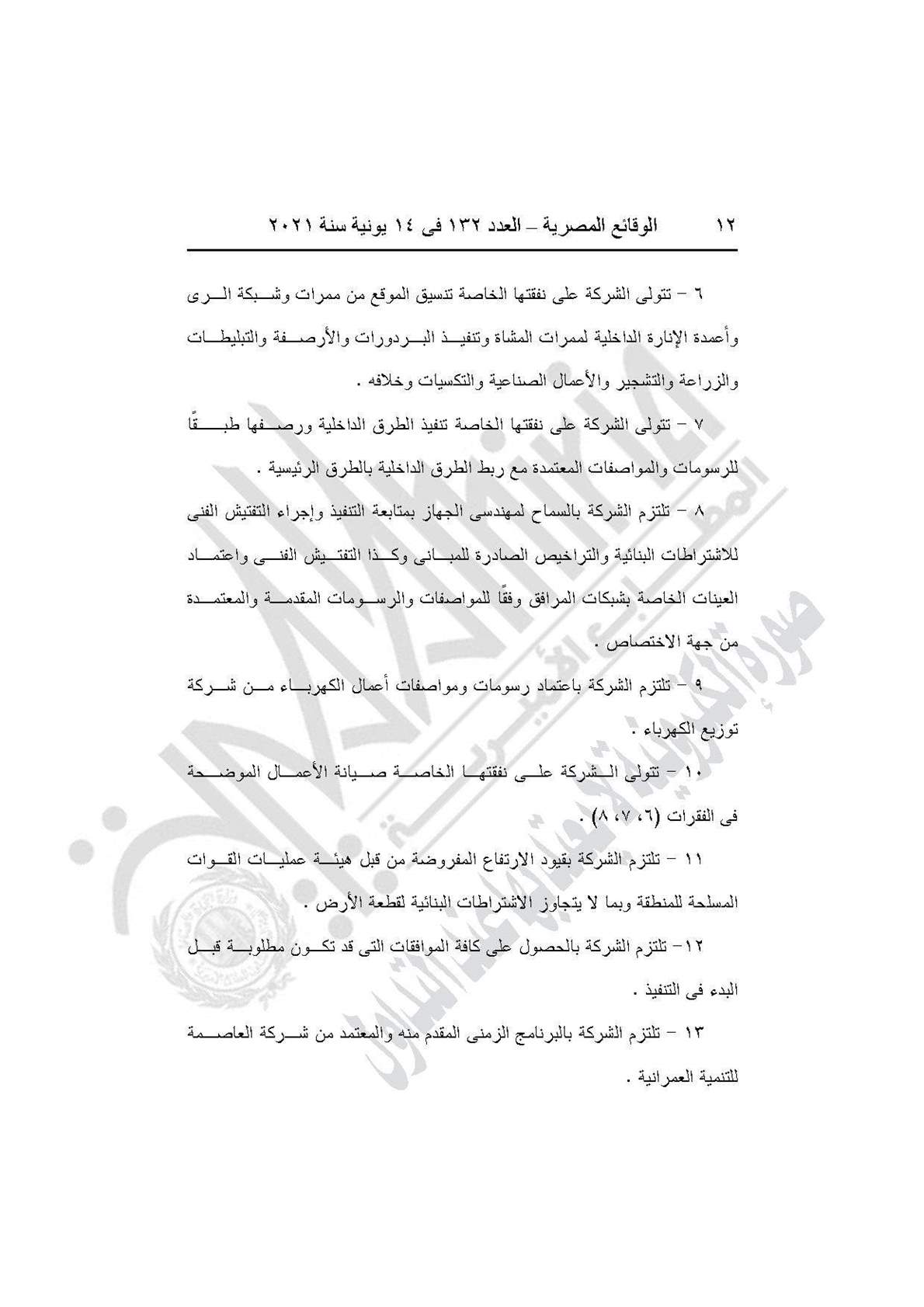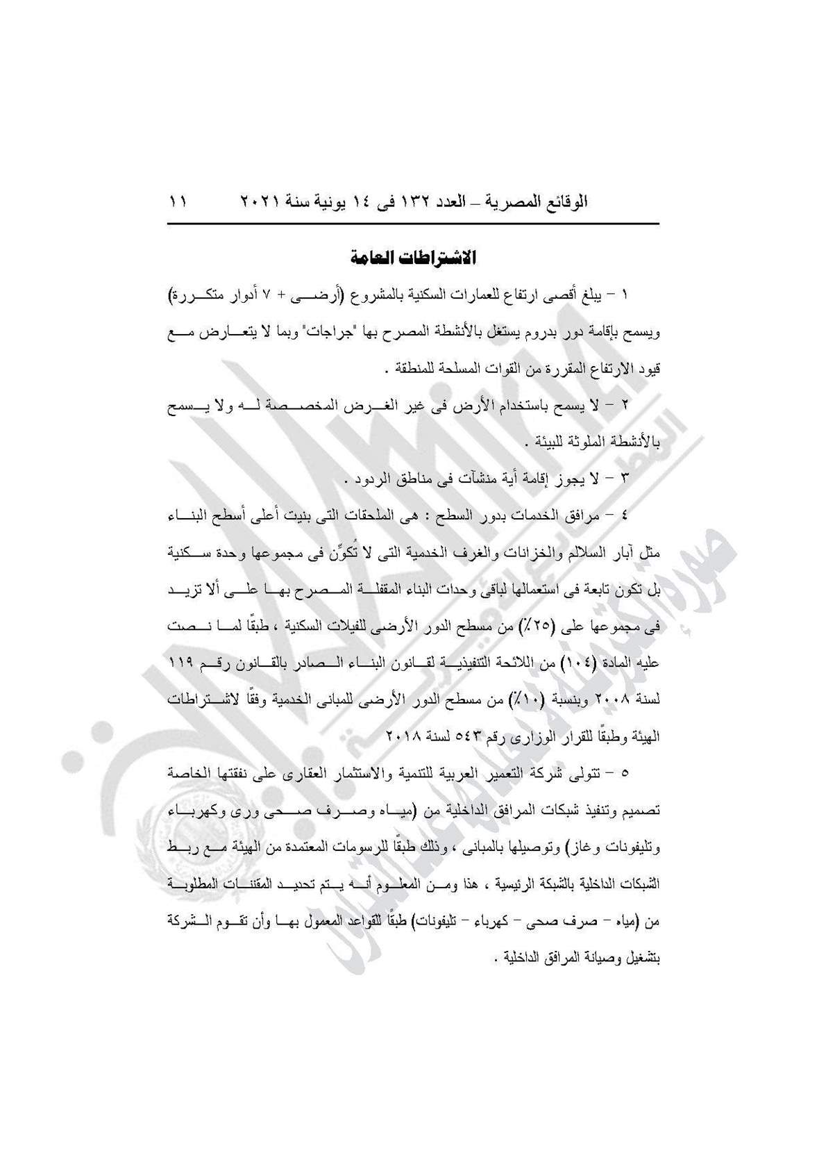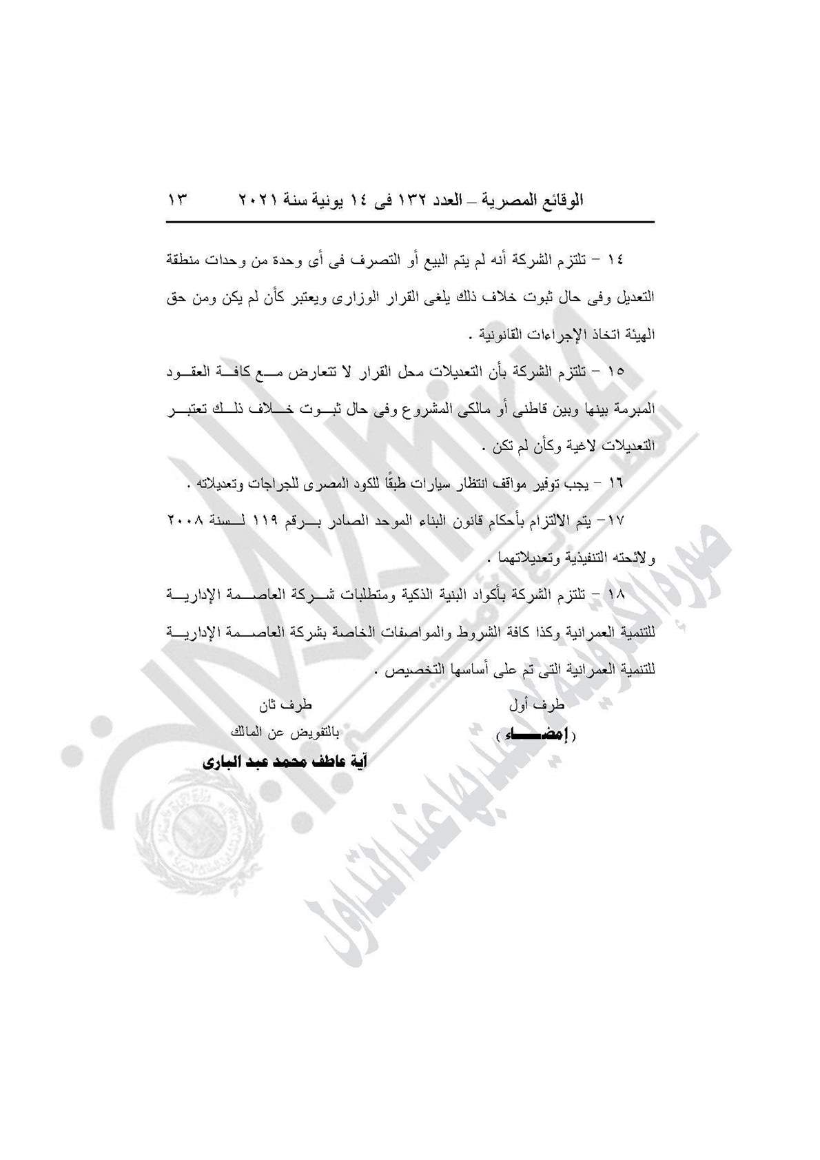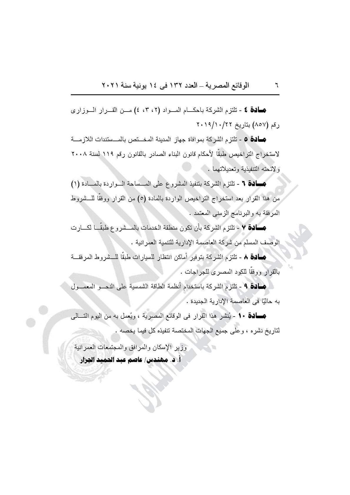 وجاء في المادة الثانية للقرار "تلتزم الشركة بالتعهد الموقع منهابأنه لمر يتم البيع أو التصرف في أي وحدة من وحدات منطقة التعديل، وفي حالة ثبوت خلاف ذلك يلغى القرار الوزاري ويعتبر كأن لم يكن وتتخذ الإجراءات القانونية المناسبة في هذا الشأن.