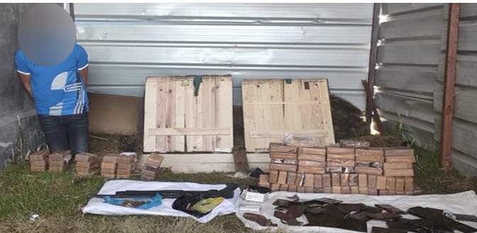 كما أمكن ضبط (1000 طربة لمخدر الحشيش وزنت 100 كيلو جرام "مخبأة بمخزن سرى أسفل أرضية الجراج" –64 طربة لمخدر الحشيش وزنت 6,400 كيلو جرام بداخل سيارة –2 فرد خرطوش – طبنجة معدلة - عدد من الطلقات مختلفة الأعيرة).