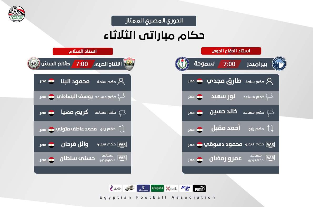 أعلنت لجنة الحكام باتحاد الكرة برئاسة وجيه أحمد أسماء حكام مباراتي غد الثلاثاء ضمن منافسات الدوري المصري الممتاز على النحو التالي: