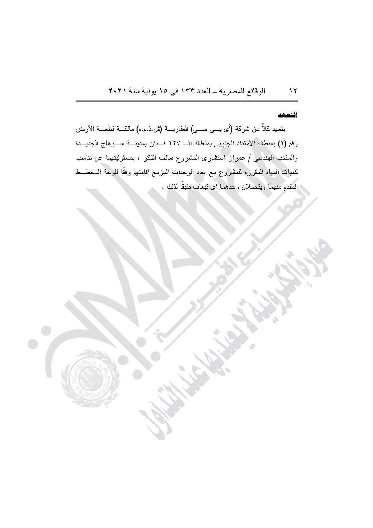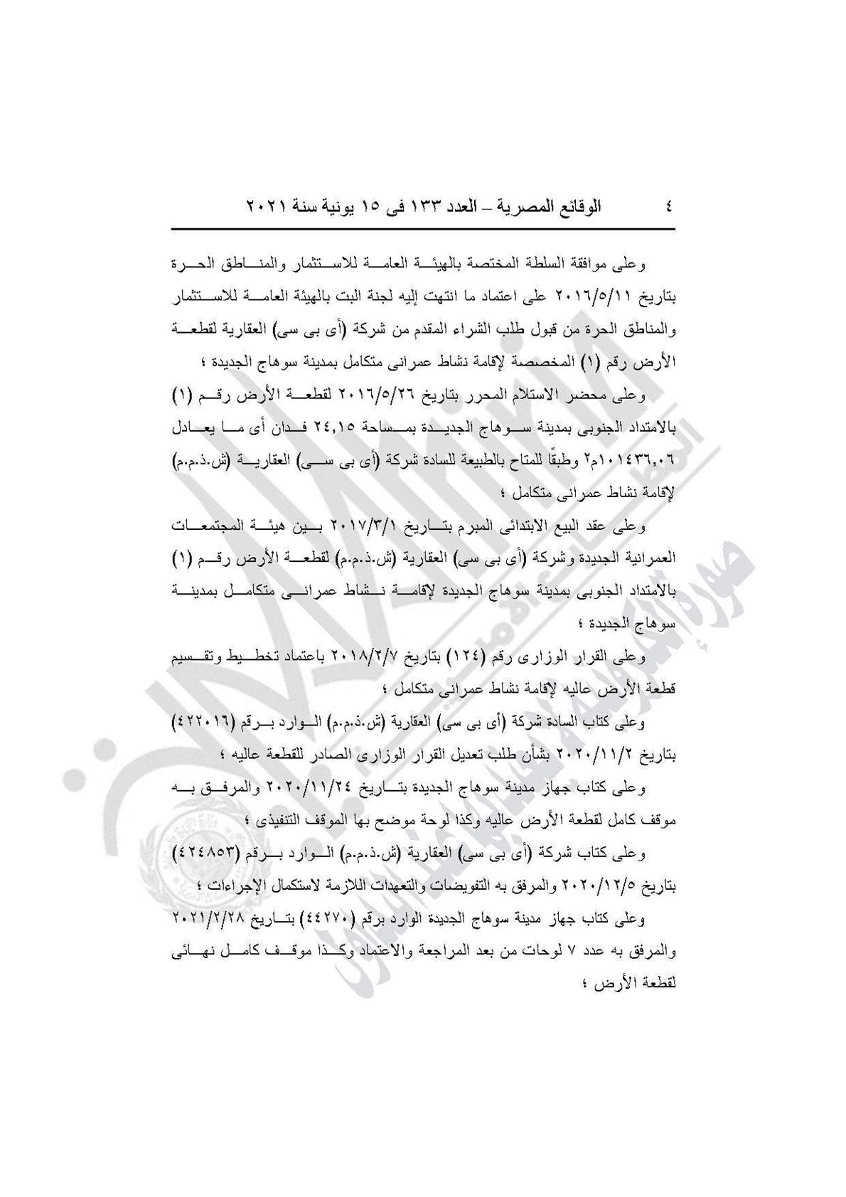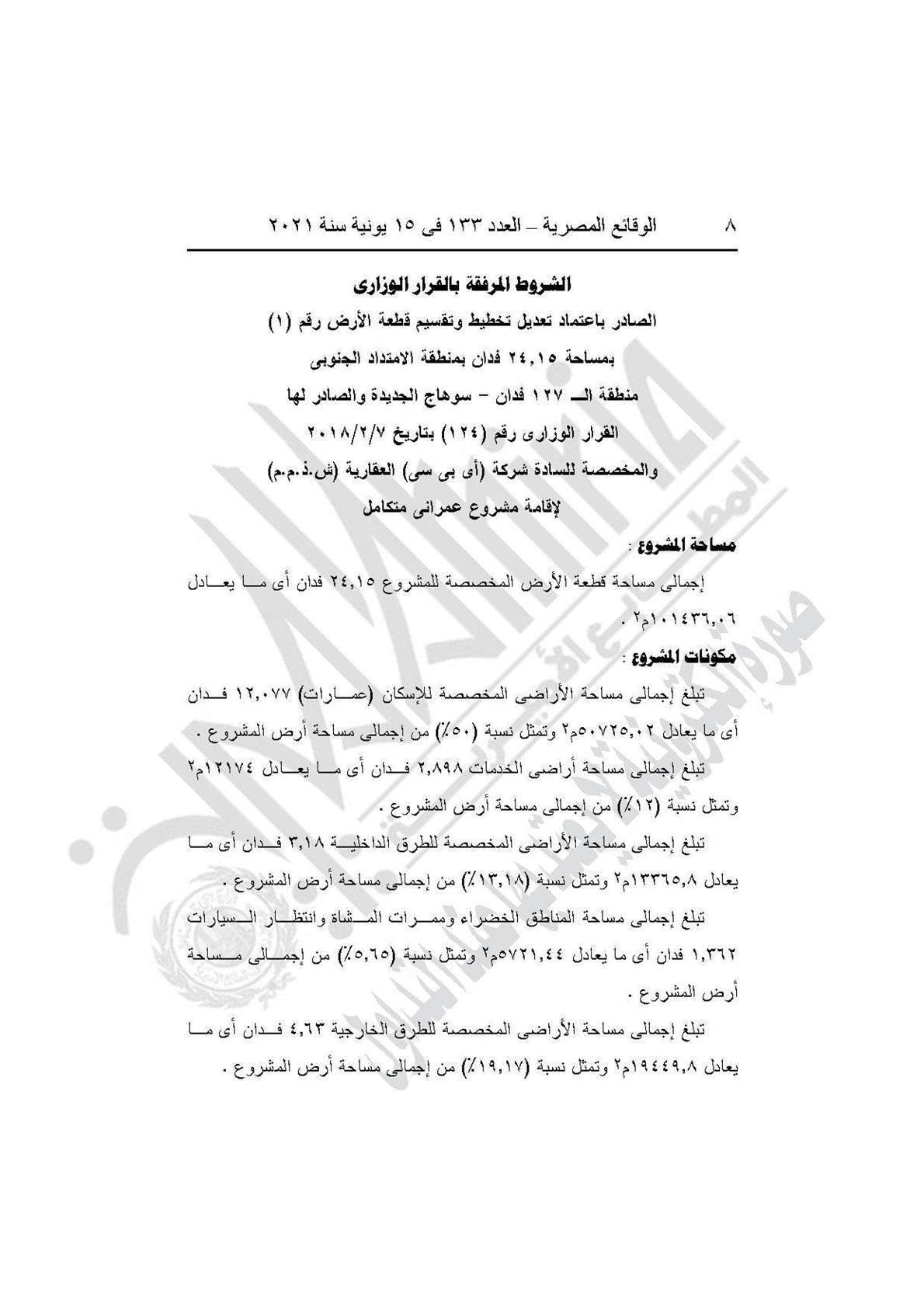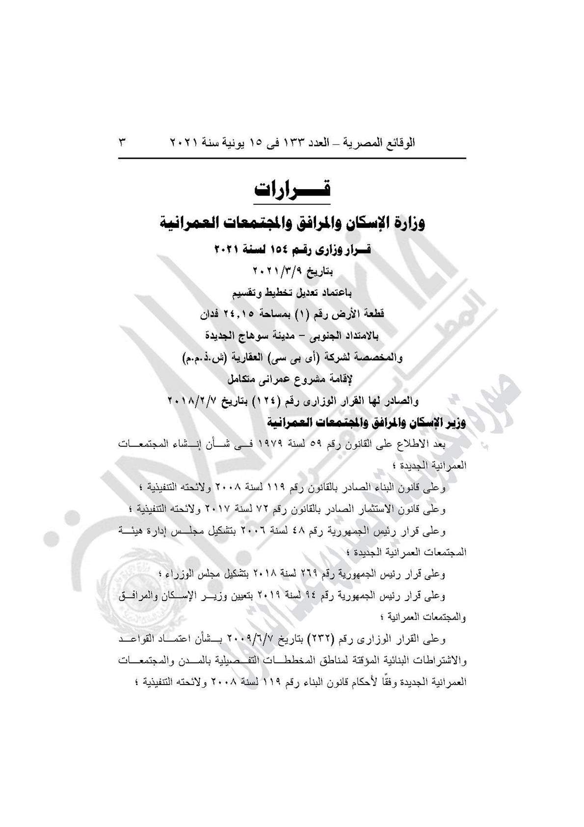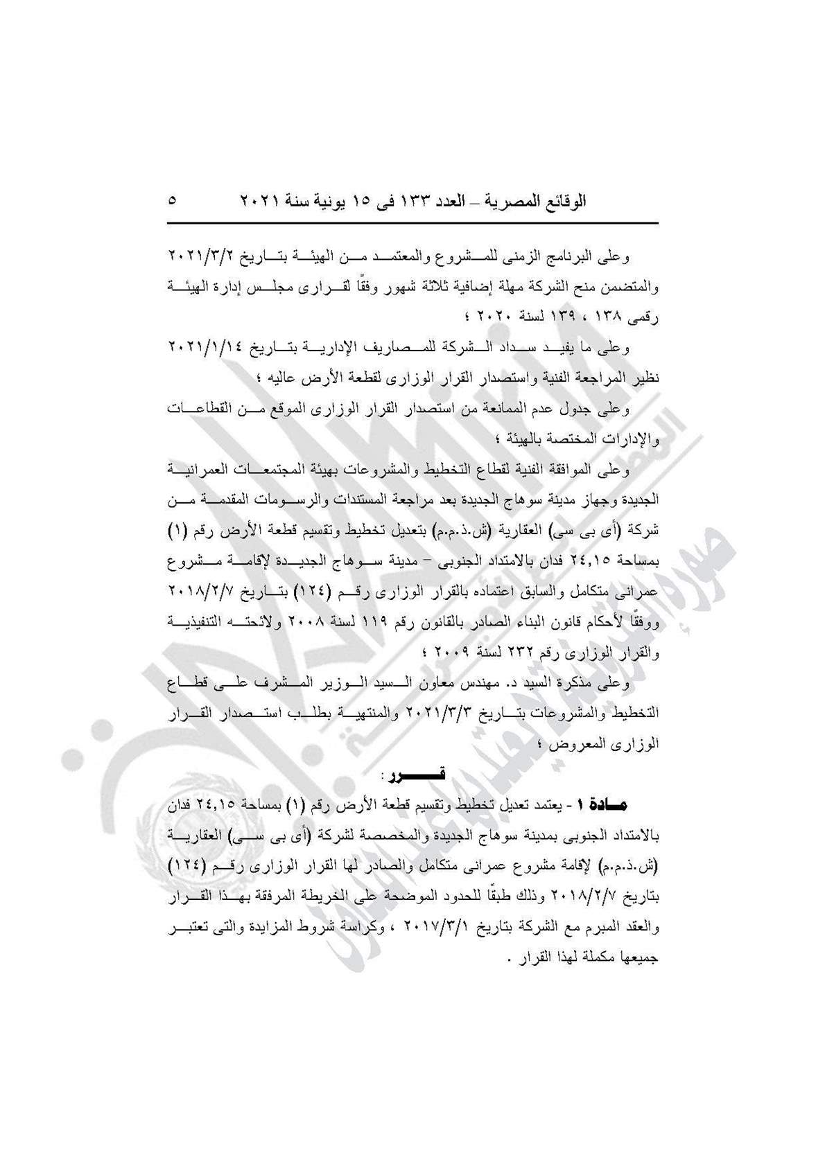 ونصت المادة الأولي للقرار على اعتماد تعديل تخطيط وتقسيم قطعة الأرض رقم (1) بمساحة 24.15 فدان بالامتداد الجنوبى، مدينة سوهاج الجديدة والمخصصة لشركة (أى بى سى) العقارية (ش.ذ.م.م) لإقامة مشروع عمرانى متكامل والصادر لها القرار الوزارى رقم (124) بتاريخ 7/2/2018، وذلك طبقًا للحدود على الخريطة بهذا القرار والعقد المبرم مع الشركة بتاريخ 1/3/2017، وكراسة شروط المزايدة.