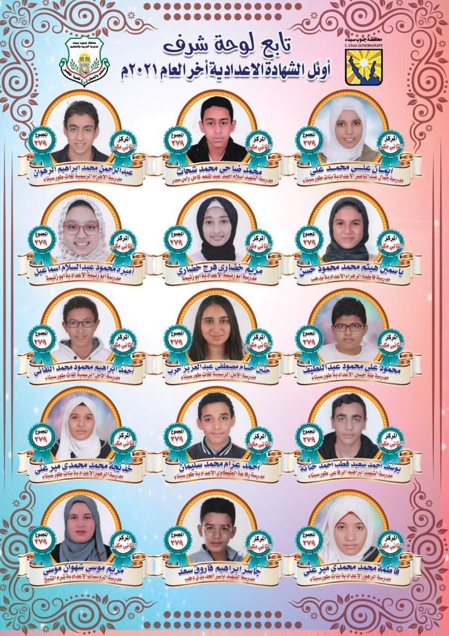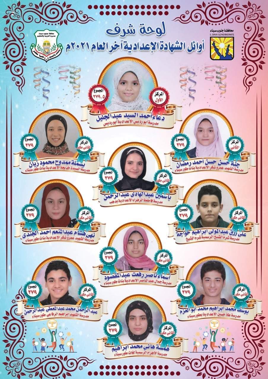 أعلنت مديرية التربية والتعليم بجنوب سيناء عن أوائل الشهادة الإعدادية للفصل الدراسى الثاني 2020 - 2021.