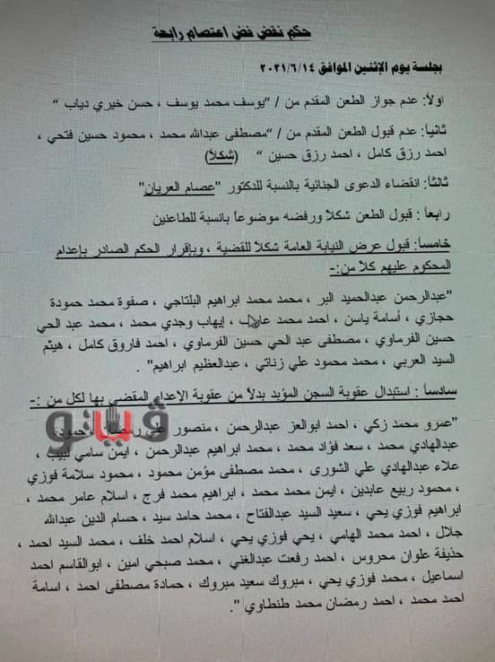 سادسا: استبدال عقوبة السجن المؤبد بدلا من عقوبة الإعدام بها لكل من: عمرو محمد زكي، احمد ابو العز عبد الرحمن، منصور علي رمضان، حمودة عبد الهادي محمد، سعد فؤاد محمد، محمد ابراهيم عبد الرحمن، ايمن سامي لبيب، علاء عبد الهادي علي الشوري، محمد مصطفي مؤمن محمود، محمود سلامة فوزي ، محمود ربيع عابدين، ايمن محمد محمد ، ابراهيم محمد فرج، اسلام عامر محمد، ابراهيم فوزي يحيي، سعيد السيد عبد الفتاح ، محمد حامد سيد، حسام الدين عبد الله جلال، احمد محمد الهامي، يحيي فوزي يحيي، اسلام احمد خلف، محمد السيد احمد، حذفة علوان محروس، احمد رفعت عبد الغني، محمد صبحي امين، ابو القاسم احمد اسماعيل، محمد فوزي يحيي، مبروك سعيد مبروك، حمادة مصطفي احمد، اسامة احمد محمد، احمد رمضان محمد طنطاوي