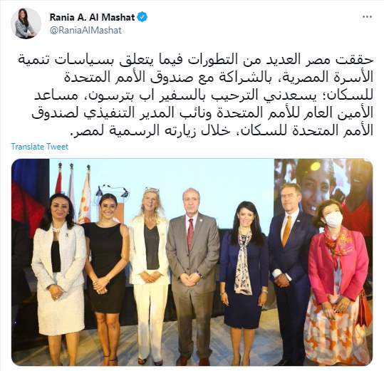 وكتبت رانيا المشاط تغريدة على تويتر "حققت مصر العديد من التطورات فيما يتعلق بسياسات تنمية الأسرة المصرية، بالشراكة مع صندوق الأمم المتحدة للسكان؛ يسعدني الترحيب بالسفير اب بترسون، مساعد الأمين العام للأمم المتحدة ونائب المدير التنفيذي لصندوق الأمم المتحدة للسكان، خلال زيارته الرسمية لمصر"